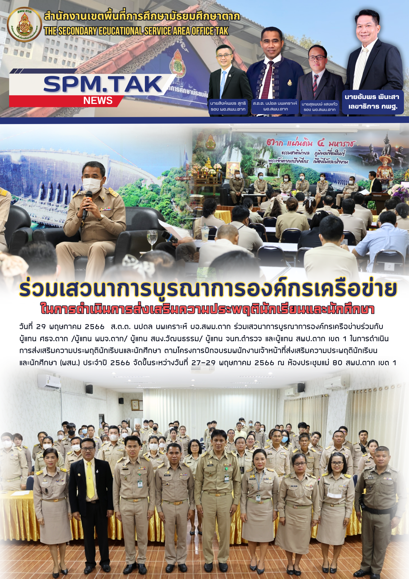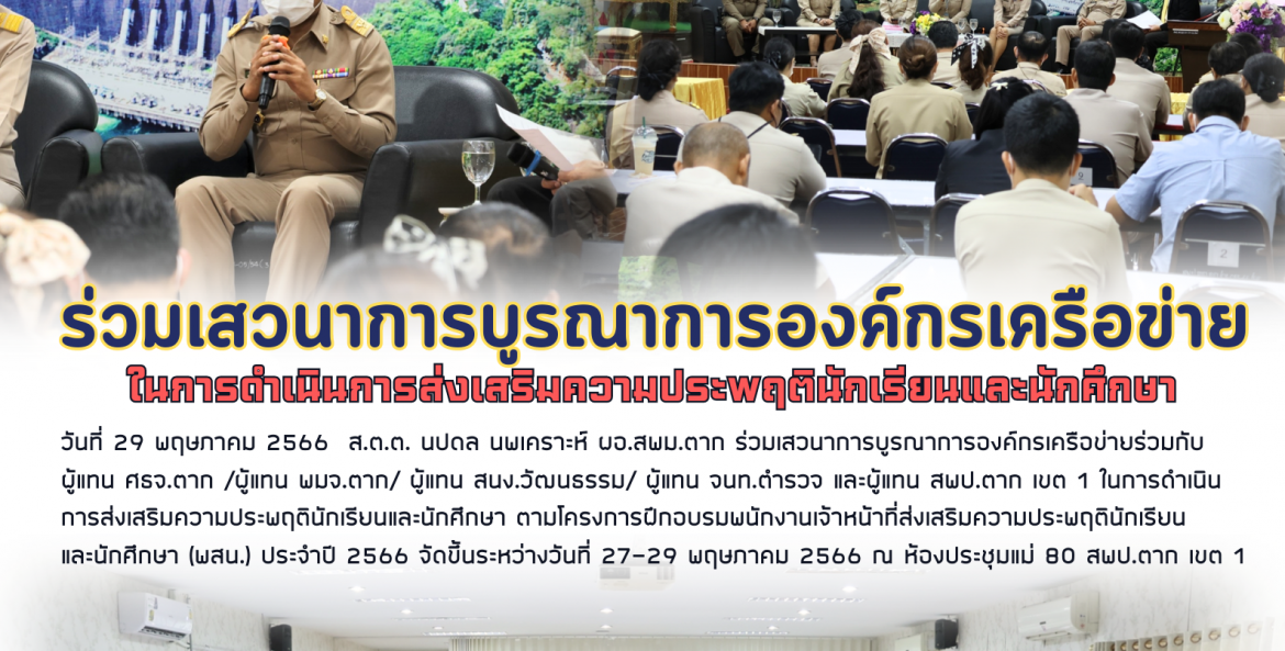 วันที่ 29 พฤษภาคม 2566 ส.ต.ต. นปดล นพเคราะห์ ผอ.สพม.ตาก ร่วมเสวนาการบูรณาการองค์กรเครือข่ายร่วมกับ ผู้แทน ศธจ.ตาก /ผู้แทน พมจ.ตาก/ ผู้แทน สนง.วัฒนธรรม/ ผู้แทน จนท.ตำรวจ และผู้แทน สพป.ตาก เขต 1 ในการดำเนินการส่งเสริมความประพฤตินักเรียนและนักศึกษา ตามโครงการฝึกอบรมพนักงานเจ้าหน้าที่ส่งเสริมความประพฤตินักเรียน และนักศึกษา (พสน.) ประจำปี 2566 จัดขึ้นระหว่างวันที่ 27-29 พฤษภาคม 2566 ณ ห้องประชุมแม่ 80 สพป.ตาก เขต 1 ขอบคุณภาพจาก สพป ตาก เขต1