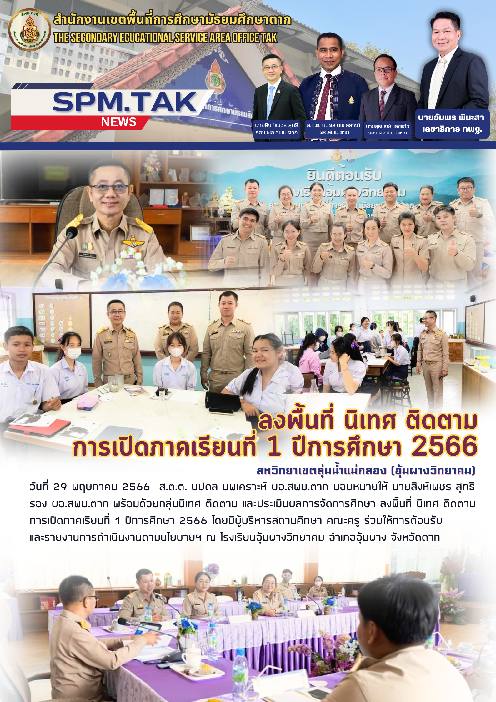 วันที่ 29 พฤษภาคม 2566 ส.ต.ต. นปดล นพเคราะห์ ผอ.สพม.ตาก มอบหมายให้ นายสิงห์เพชร สุทธิ รอง ผอ.สพม.ตาก พร้อมด้วยกลุ่มนิเทศ ติดตาม และประเมินผลการจัดการศึกษา ลงพื้นที่ นิเทศ ติดตาม การเปิดภาคเรียนที่ 1 ปีการศึกษา 2566 โดยมีผู้บริหารสถานศึกษา คณะครู ร่วมให้การต้อนรับ และรายงานการดำเนินงานตามนโยบายฯ ณ โรงเรียนอุ้มผางวิทยาคม อำเภออุ้มผาง จังหวัดตาก