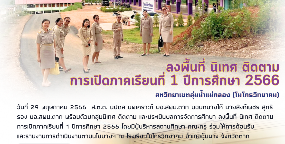 วันที่ 29 พฤษภาคม 2566 ส.ต.ต. นปดล นพเคราะห์ ผอ.สพม.ตาก มอบหมายให้ นายสิงห์เพชร สุทธิ รอง ผอ.สพม.ตาก พร้อมด้วยกลุ่มนิเทศ ติดตาม และประเมินผลการจัดการศึกษา ลงพื้นที่ นิเทศ ติดตาม การเปิดภาคเรียนที่ 1 ปีการศึกษา 2566 โดยมีผู้บริหารสถานศึกษา คณะครู ร่วมให้การต้อนรับ และรายงานการดำเนินงานตามนโยบายฯ ณ โรงเรียนอุ้มผางวิทยาคม อำเภออุ้มผาง จังหวัดตาก