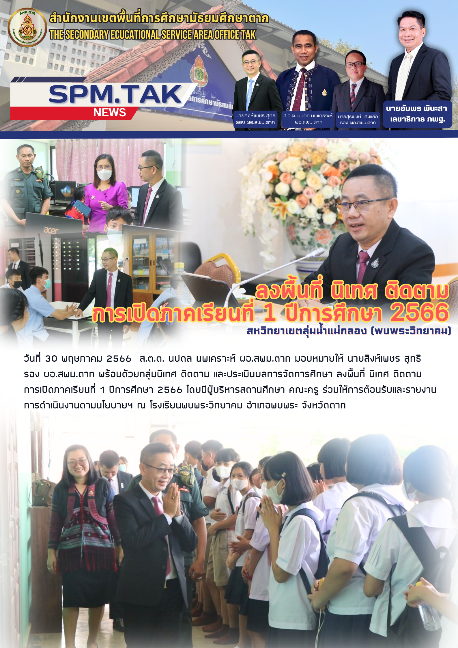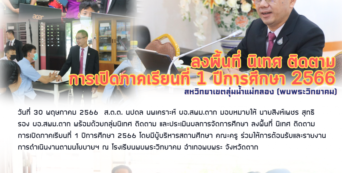 วันที่ 30 พฤษภาคม 2566 ส.ต.ต. นปดล นพเคราะห์ ผอ.สพม.ตาก มอบหมายให้ นายสิงห์เพชร สุทธิ รอง ผอ.สพม.ตาก พร้อมด้วยกลุ่มนิเทศ ติดตาม และประเมินผลการจัดการศึกษา ลงพื้นที่ นิเทศ ติดตาม การเปิดภาคเรียนที่ 1 ปีการศึกษา 2566 โดยมีผู้บริหารสถานศึกษา คณะครู ร่วมให้การต้อนรับและรายงาน การดำเนินงานตามนโยบายฯ ณ โรงเรียนพบพระวิทยาคม อำเภอพบพระ จังหวัดตาก