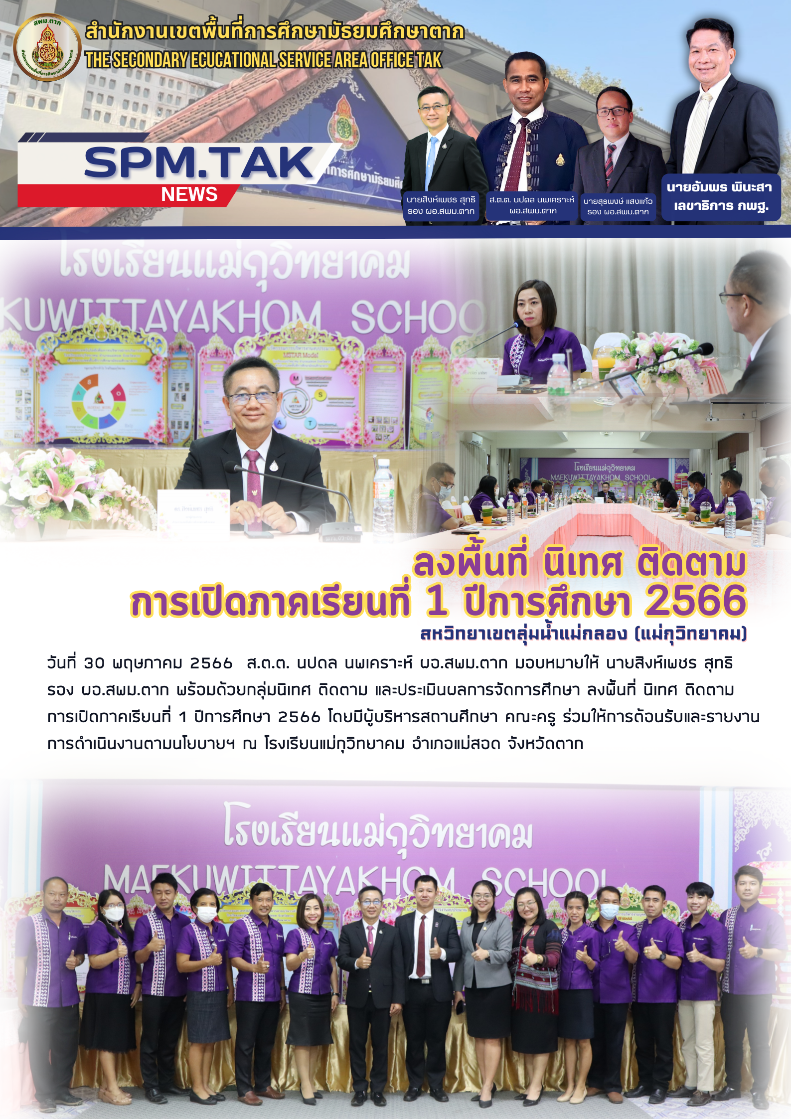 วันที่ 30 พฤษภาคม 2566 ส.ต.ต. นปดล นพเคราะห์ ผอ.สพม.ตาก มอบหมายให้ นายสิงห์เพชร สุทธิ รอง ผอ.สพม.ตาก พร้อมด้วยกลุ่มนิเทศ ติดตาม และประเมินผลการจัดการศึกษา ลงพื้นที่ นิเทศ ติดตาม การเปิดภาคเรียนที่ 1 ปีการศึกษา 2566 โดยมีผู้บริหารสถานศึกษา คณะครู ร่วมให้การต้อนรับและรายงาน การดำเนินงานตามนโยบายฯ ณ โรงเรียนแม่กุวิทยาคม อำเภอแม่สอด จังหวัดตาก