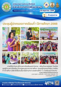 นางศรีรัตน์ อินทนุ ผู้อำนวยการโรงเรียนแม่ปะวิทยาคม พร้อมด้วยนายสุรพงษ์ โนนน้อย รองผู้อำนวยการโรงเรียน คณะครูเเละบุคลากรทางการศึกษา ประชุมผู้ปกครองนักเรียน ภาคเรียนที่ 1 ปีการศึกษา 2566 เพื่อชี้เเจงนโยบายในด้านต่าง ๆ ของสถานศึกษา ณ โรงเรียนเเม่ปะวิทยาคม