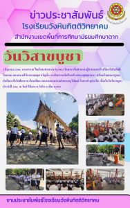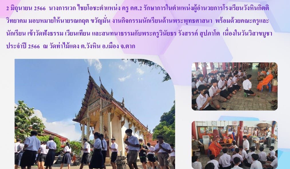กิจกรรมวันวิสาขบูชา โรงเรียนวังหินกิตติวิทยาคม ทิพาพร เมืองครอง 5 มิถุนายน 2566 กิจกรรมวันวิสาขบูชา ประจำปี 2566 คณะครูและนักเรียนโรงเรียนวังหินกิตติวิทยาคม ร่วมกิจกรรมวันวิสาขบูชา เข้าวัด ฟังธรรม เวียนเทียนและสนทนาธรรม ณ วัดท่าไม้แดง ต.วังหิน อ.เมือง จ.ตาก จำนวนคนดู 10