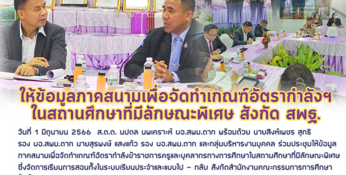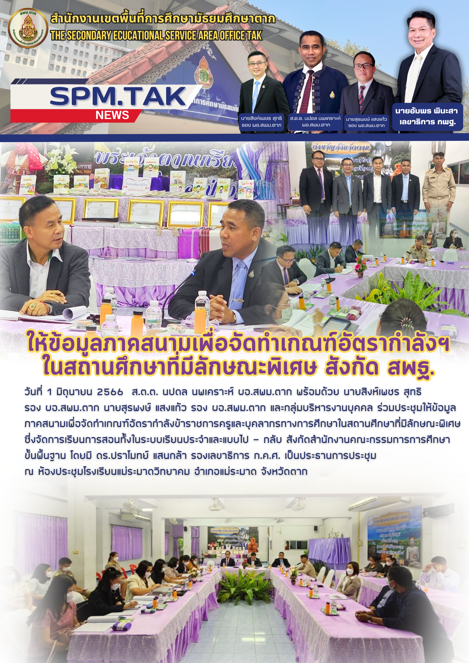 วันที่ 1 มิถุนายน 2566 ส.ต.ต. นปดล นพเคราะห์ ผอ.สพม.ตาก พร้อมด้วย นายสิงห์เพชร สุทธิ รอง ผอ.สพม.ตาก นายสุรพงษ์ แสงแก้ว รอง ผอ.สพม.ตาก และกลุ่มบริหารงานบุคคล ร่วมประชุมให้ข้อมูล ภาคสนามเพื่อจัดทำเกณฑ์อัตรากำลังข้าราชการครูและบุคลากรทางการศึกษาในสถานศึกษาที่มีลักษณะพิเศษ ซึ่งจัดการเรียนการสอนทั้งในระบบเรียนประจำและแบบไป – กลับ สังกัดสำนักงานคณะกรรมการการศึกษา ขั้นพื้นฐาน โดยมี ดร.ปราโมทย์ แสนกล้า รองเลขาธิการ ก.ค.ศ. เป็นประธานการประชุม ณ ห้องประชุมโรงเรียนแม่ระมาดวิทยาคม อำเภอแม่ระมาด จังหวัดตาก