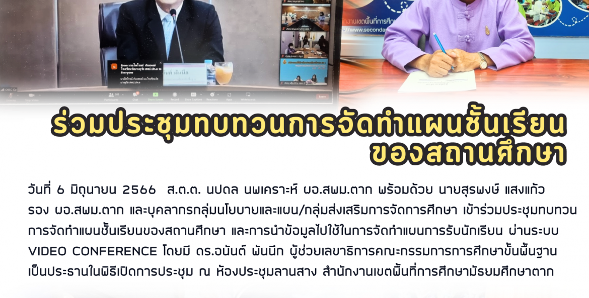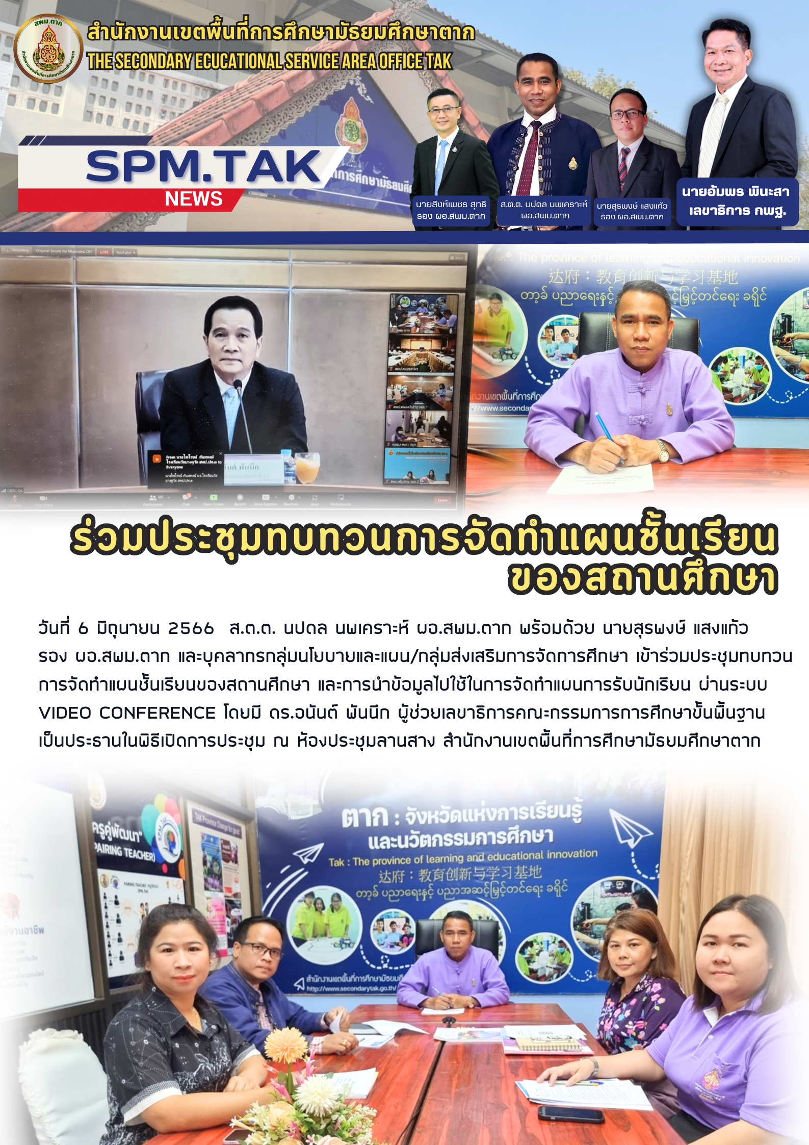 วันที่ 6 มิถุนายน 2566 ส.ต.ต. นปดล นพเคราะห์ ผอ.สพม.ตาก พร้อมด้วย นายสุรพงษ์ แสงแก้ว รอง ผอ.สพม.ตาก และบุคลากรกลุ่มนโยบายและแผน/กลุ่มส่งเสริมการจัดการศึกษา เข้าร่วมประชุมทบทวน การจัดทำแผนชั้นเรียนของสถานศึกษา และการนำข้อมูลไปใช้ในการจัดทำแผนการรับนักเรียน ผ่านระบบ Video Conference โดยมี ดร.อนันต์ พันนึก ผู้ช่วยเลขาธิการคณะกรรมการการศึกษาขั้นพื้นฐาน เป็นประธานในพิธีเปิดการประชุม ณ ห้องประชุมลานสาง สำนักงานเขตพื้นที่การศึกษามัธยมศึกษาตาก