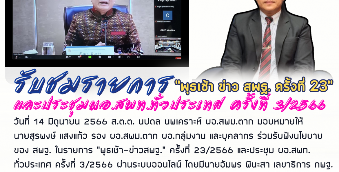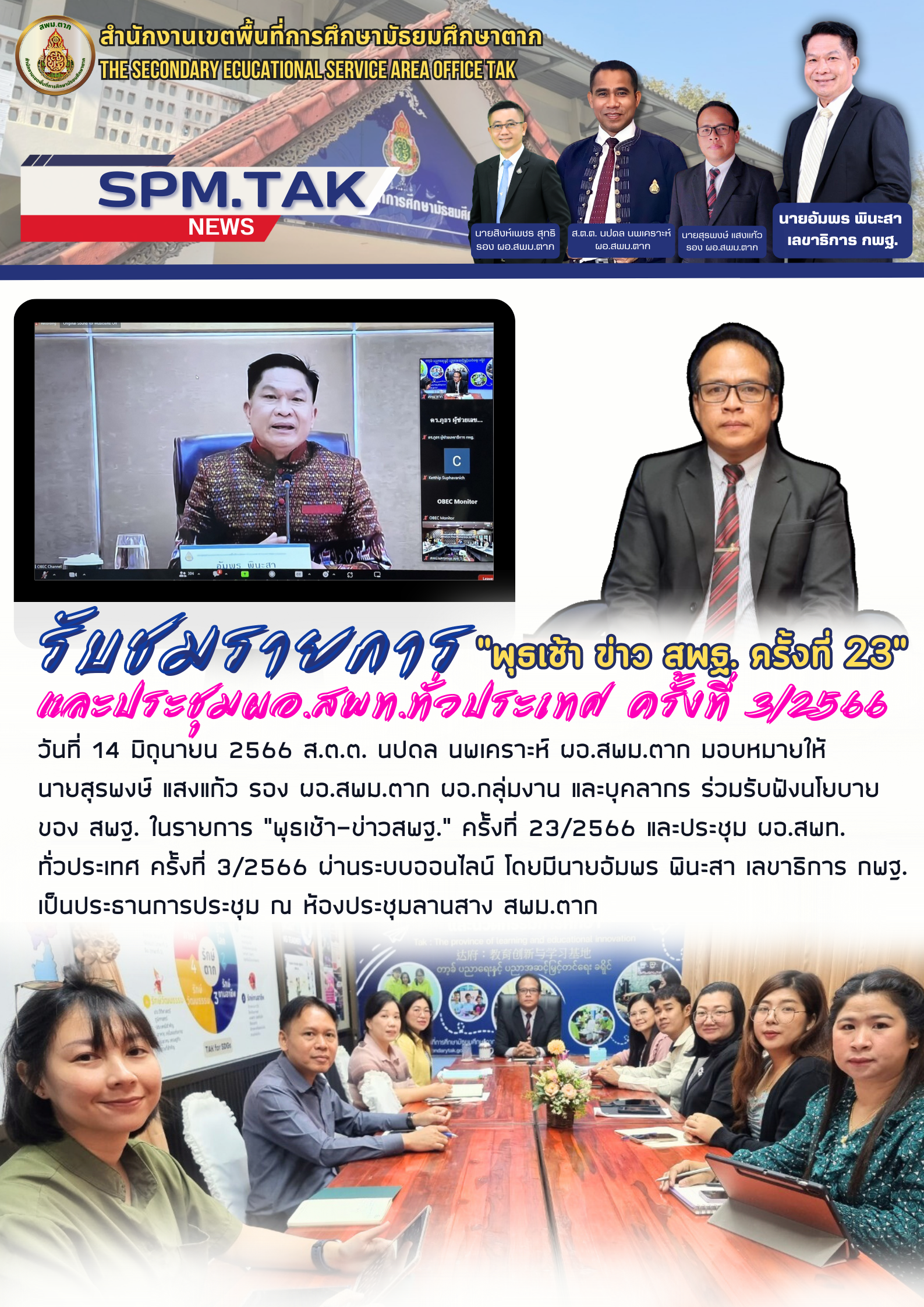 วันที่ 14 มิถุนายน 2566 ส.ต.ต. นปดล นพเคราะห์ ผอ.สพม.ตาก มอบหมายให้ นายสุรพงษ์ แสงแก้ว รอง ผอ.สพม.ตาก ผอ.กลุ่มงาน และบุคลากร ร่วมรับฟังนโยบาย ของ สพฐ. ในรายการ “พุธเช้า–ข่าวสพฐ.” ครั้งที่ 23/2566 และประชุม ผอ.สพท. ทั่วประเทศ ครั้งที่ 3/2566 ผ่านระบบออนไลน์ โดยมีนายอัมพร พินะสา เลขาธิการ กพฐ. เป็นประธานการประชุม ณ ห้องประชุมลานสาง สพม.ตาก