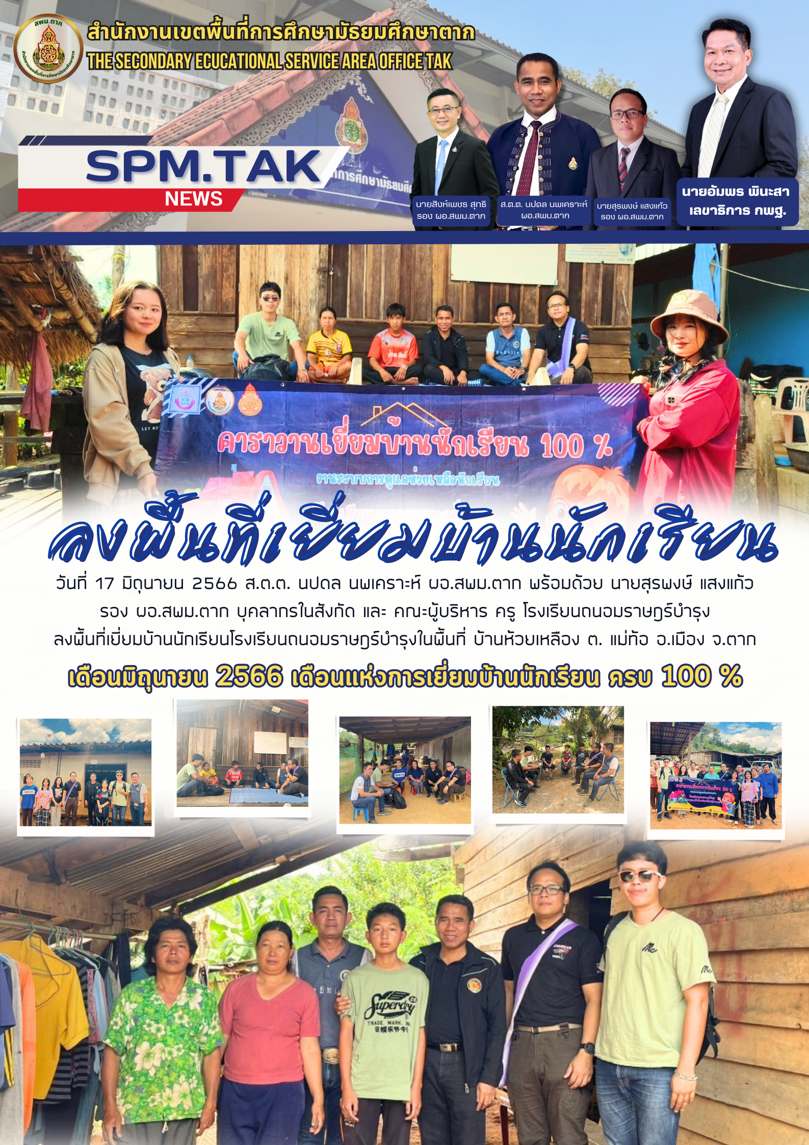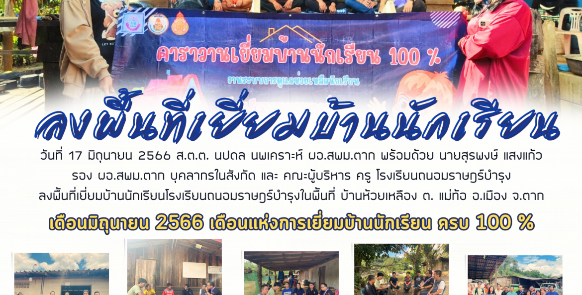 วันที่ 17 มิถุนายน 2566 ส.ต.ต. นปดล นพเคราะห์ ผอ.สพม.ตาก พร้อมด้วย นายสุรพงษ์ แสงแก้ว รอง ผอ.สพม.ตาก บุคลากรในสังกัด และ คณะผู้บริหาร ครู โรงเรียนถนอมราษฎร์บำรุง ลงพื้นที่เยี่ยมบ้านนักเรียนโรงเรียนถนอมราษฎร์บำรุงในพื้นที่ บ้านห้วยเหลือง ต. แม่ท้อ อ.เมือง จ.ตาก