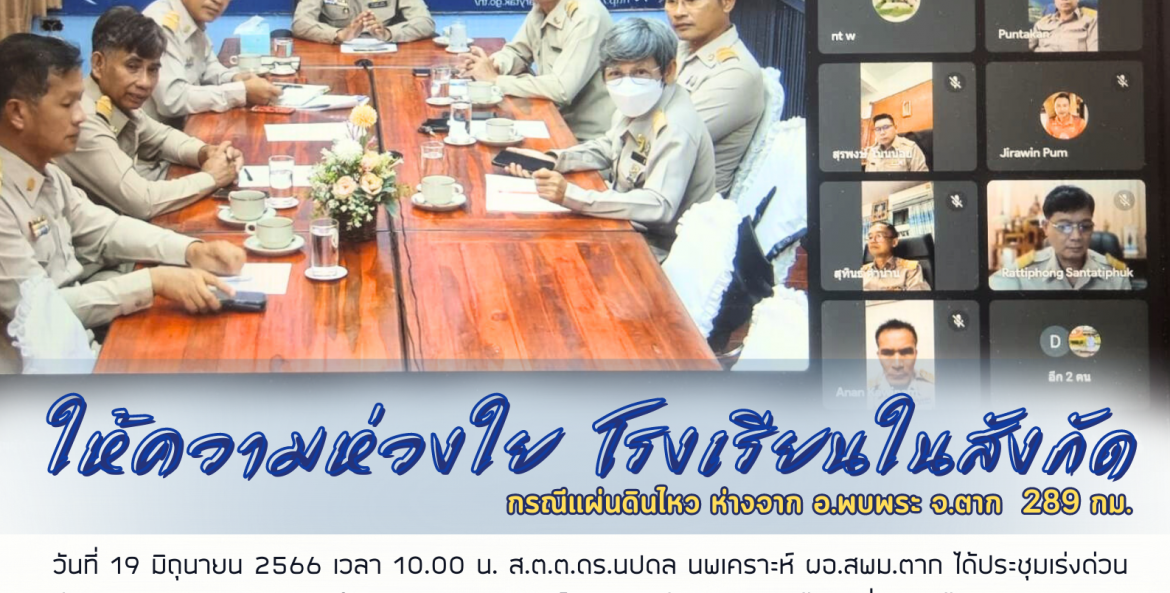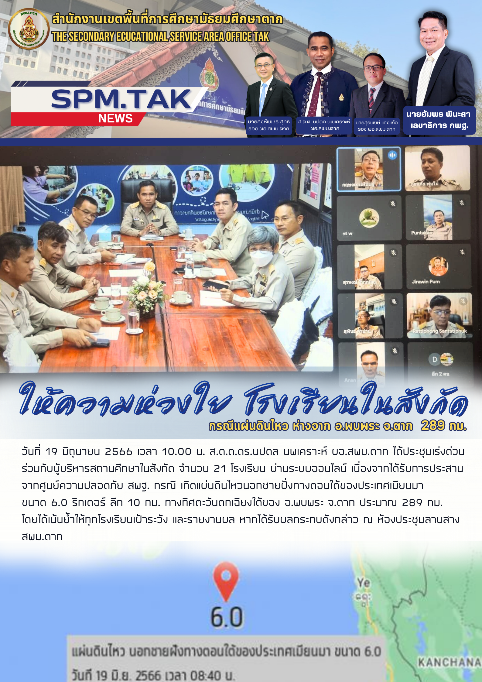 วันที่ 19 มิถุนายน 2566 เวลา 10.00 น. ส.ต.ต.ดร.นปดล นพเคราะห์ ผอ.สพม.ตาก ได้ประชุมเร่งด่วนร่วมกับผู้บริหารสถานศึกษาในสังกัด จำนวน 21 โรงเรียน ผ่านระบบออนไลน์ เนื่องจากได้รับการประสาน จากศูนย์ความปลอดภัย สพฐ. กรณี เกิดแผ่นดินไหวนอกชายฝั่งทางตอนใต้ของประเทศเมียนมา ขนาด 6.0 ริกเตอร์ ลึก 10 กม. ทางทิศตะวันตกเฉียงใต้ของ อ.พบพระ จ.ตาก ประมาณ 289 กม. โดยได้เน้นย้ำให้ทุกโรงเรียนเฝ้าระวัง และรายงานผล หากได้รับผลกระทบดังกล่าว ณ ห้องประชุมลานสาง สพม.ตาก