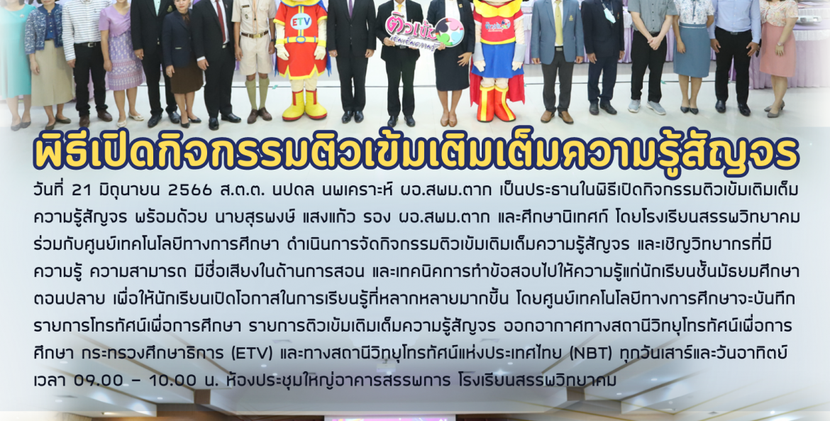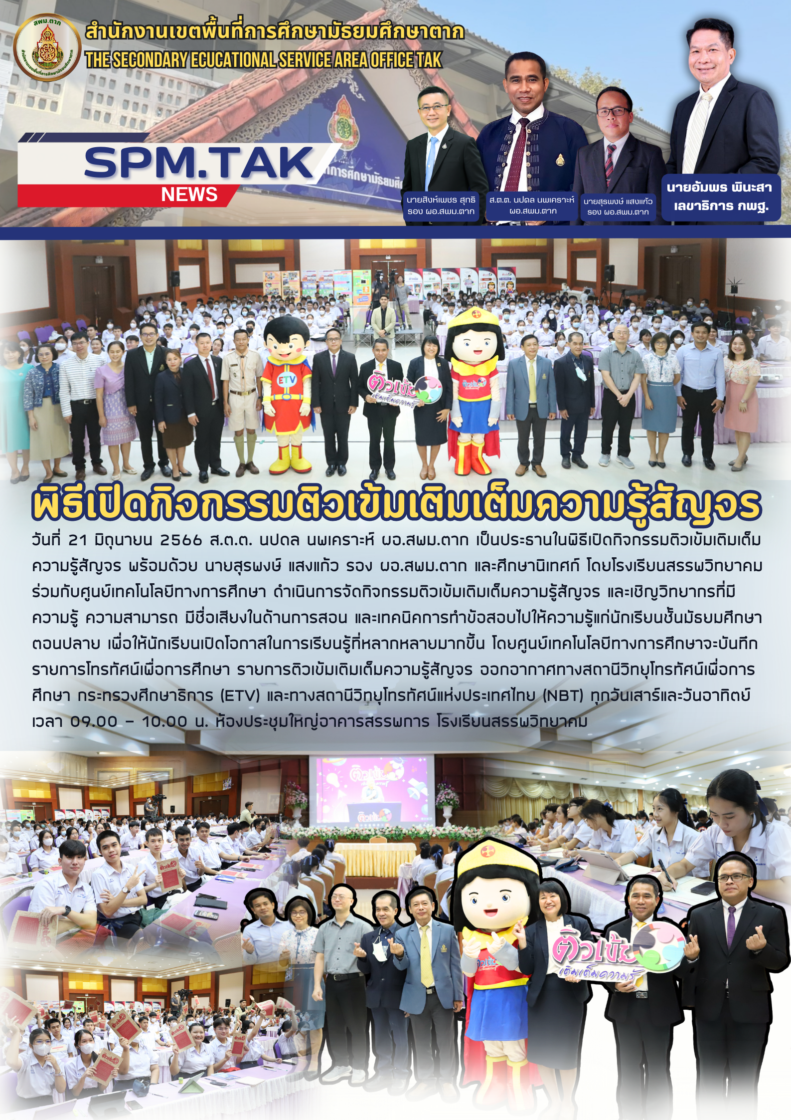 วันที่ 21 มิถุนายน 2566 ส.ต.ต. นปดล นพเคราะห์ ผอ.สพม.ตาก เป็นประธานในพิธีเปิดกิจกรรมติวเข้มเติมเต็มความรู้สัญจร พร้อมด้วย นายสุรพงษ์ แสงแก้ว รอง ผอ.สพม.ตาก และศึกษานิเทศก์ โดยโรงเรียนสรรพวิทยาคมร่วมกับศูนย์เทคโนโลยีทางการศึกษา ดำเนินการจัดกิจกรรมติวเข้มเติมเต็มความรู้สัญจร และเชิญวิทยากรที่มี ความรู้ ความสามารถ มีชื่อเสียงในด้านการสอน และเทคนิคการทำข้อสอบไปให้ความรู้แก่นักเรียนชั้นมัธยมศึกษาตอนปลาย เพื่อให้นักเรียนเปิดโอกาสในการเรียนรู้ที่หลากหลายมากขึ้น โดยศูนย์เทคโนโลยีทางการศึกษาจะบันทึกรายการโทรทัศน์เพื่อการศึกษา รายการติวเข้มเติมเต็มความรู้สัญจร ออกอากาศทางสถานีวิทยุโทรทัศน์เพื่อการศึกษา กระทรวงศึกษาธิการ (ETV) และทางสถานีวิทยุโทรทัศน์แห่งประเทศไทย (NBT) ทุกวันเสาร์และวันอาทิตย์ เวลา 09.00 – 10.00 น. ห้องประชุมใหญ่อาคารสรรพการ โรงเรียนสรรพวิทยาคม