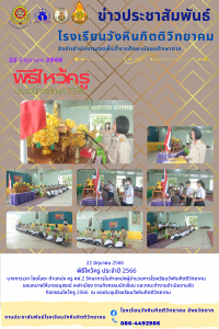 งานกิจกรรมนักเรียน ดำเนินการจัดพิธีไหว้ครู ซึ่งเป็นประเพณีปฏิบัติต่อเนื่องกันมาเพื่อให้นักเรียนแสดงถึงความเคารพและระลึกถึงคุณความดีของครู อาจารย์ ที่ได้รับประสิทธิ์ประสาทวิชาและอบรมสั่งสอนเพื่อให้ได้มาซึ่งความรู้ ฃในวันพฤหัสบดี ที่ 22 มิถุนายน 2566 ณ หอประชุมโรงเรียนวังหินกิตติวิทยาคม