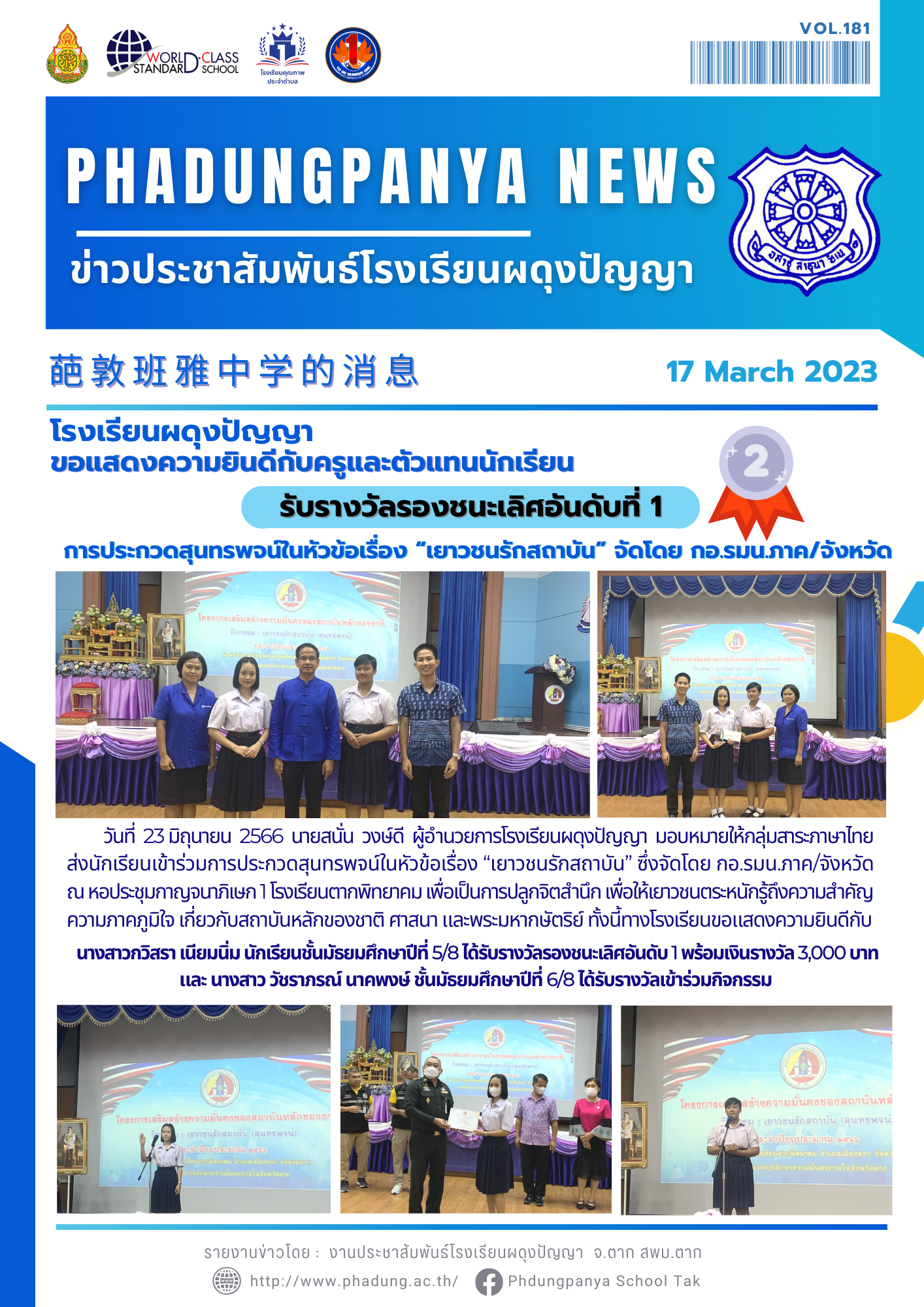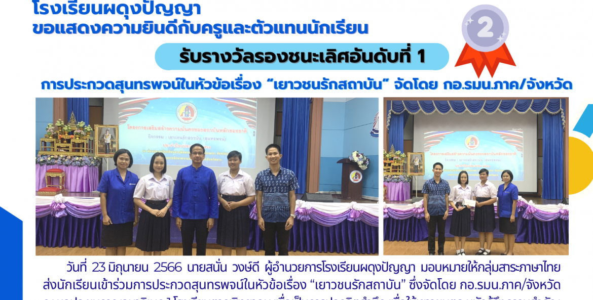 วันที่ 23 มิถุนายน 2566 นายสนั่น วงษ์ดี ผู้อำนวยการโรงเรียนผดุงปัญญา มอบหมายให้กลุ่มสาระภาษาไทย ส่งนักเรียนเข้าร่วมการประกวดสุนทรพจน์ในหัวข้อเรื่อง “เยาวชนรักสถาบัน” ซึ่งจัดโดย กอ.รมน.ภาค/จังหวัด ณ หอประชุมกาญจนาภิเษก 1 โรงเรียนตากพิทยาคม เพื่อเป็นการปลูกจิตสำนึก เพื่อให้เยาวชนตระหนักรู้ถึงความสำคัญ ความภาคภูมิใจ เกี่ยวกับสถาบันหลักของชาติ ศาสนา และพระมหากษัตริย์