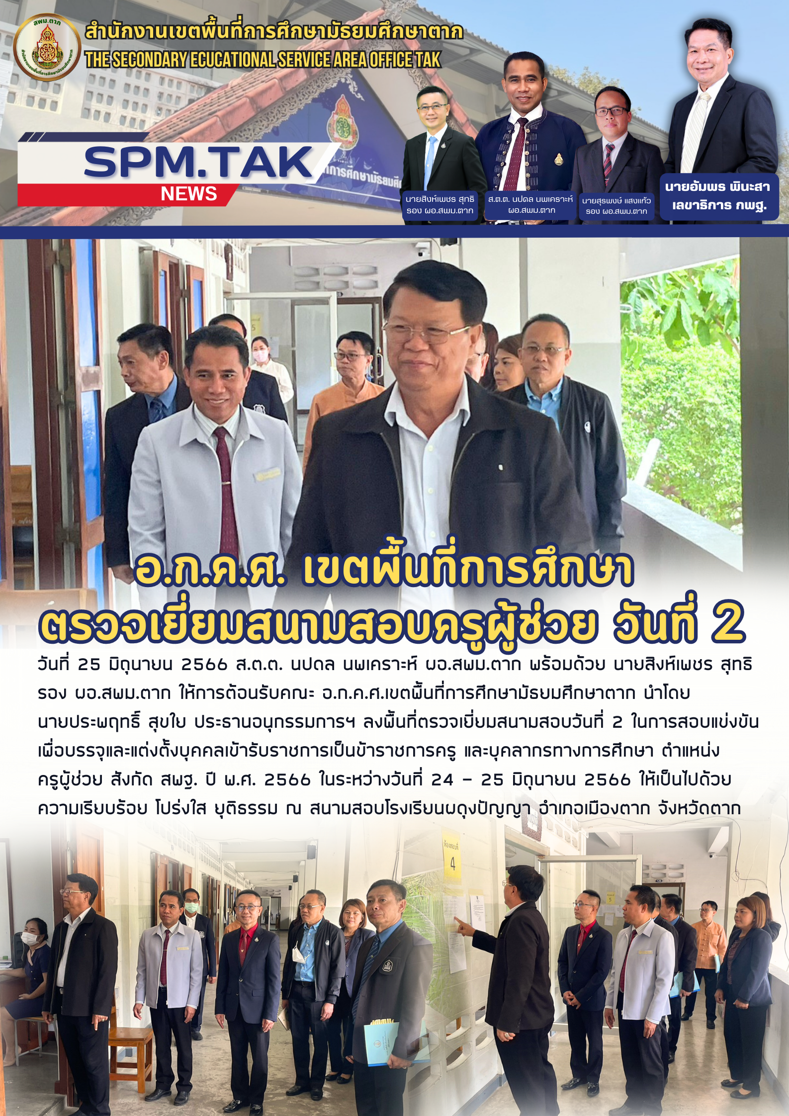 วันที่ 25 มิถุนายน 2566 ส.ต.ต. นปดล นพเคราะห์ ผอ.สพม.ตาก พร้อมด้วย นายสิงห์เพชร สุทธิ รอง ผอ.สพม.ตาก ให้การต้อนรับคณะ อ.ก.ค.ศ.เขตพื้นที่การศึกษามัธยมศึกษาตาก นำโดย นายประพฤทธิ์ สุขใย ประธานอนุกรรมการฯ ลงพื้นที่ตรวจเยี่ยมสนามสอบวันที่ 2 ในการสอบแข่งขันเพื่อบรรจุและแต่งตั้งบุคคลเข้ารับราชการเป็นข้าราชการครู และบุคลากรทางการศึกษา ตำแหน่ง ครูผู้ช่วย สังกัด สพฐ. ปี พ.ศ. 2566 ในระหว่างวันที่ 24 – 25 มิถุนายน 2566 ให้เป็นไปด้วย ความเรียบร้อย โปร่งใส ยุติธรรม ณ สนามสอบโรงเรียนผดุงปัญญา อำเภอเมืองตาก จังหวัดตาก