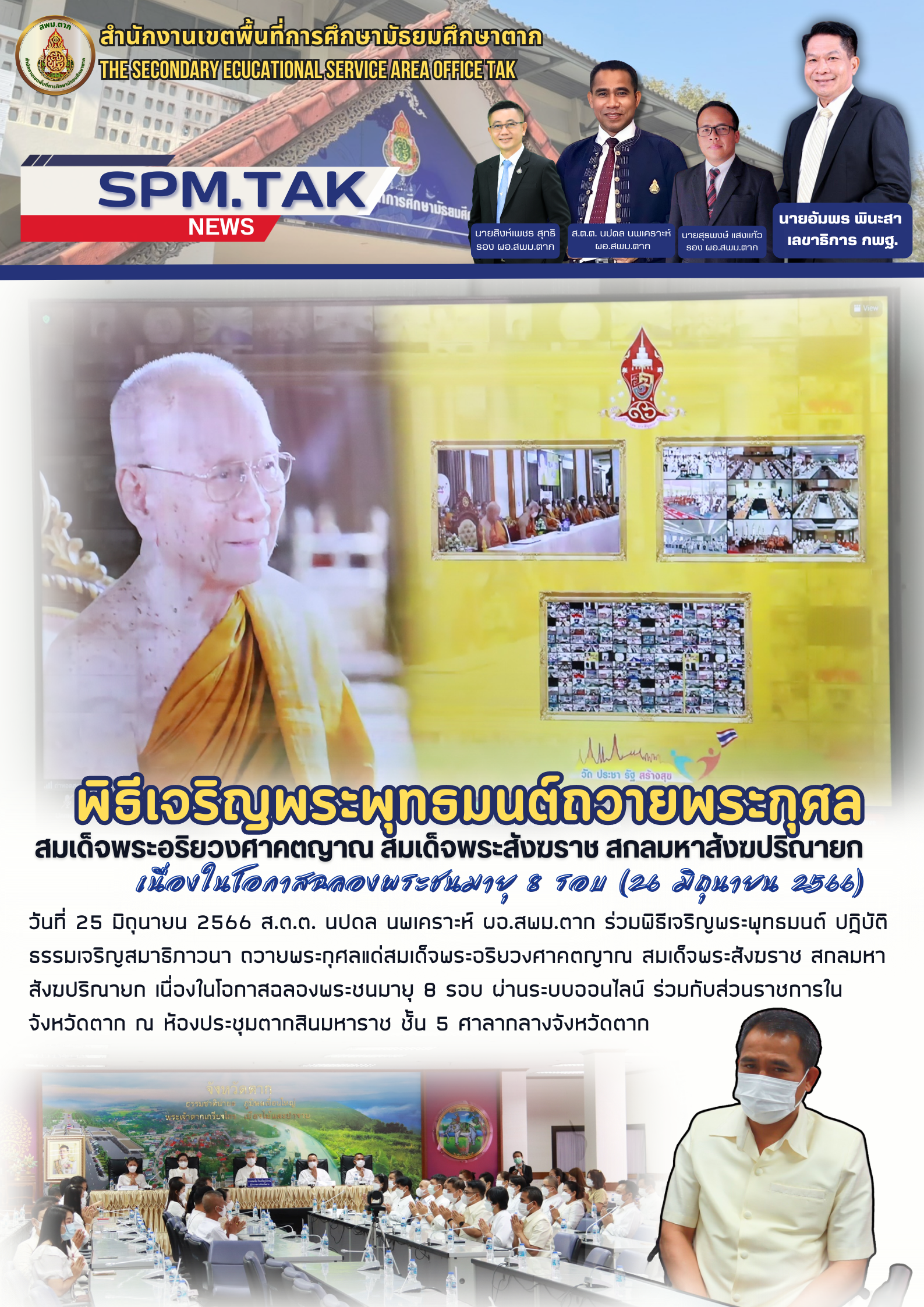 วันที่ 25 มิถุนายน 2566 ส.ต.ต. นปดล นพเคราะห์ ผอ.สพม.ตาก ร่วมพิธีเจริญพระพุทธมนต์ ปฏิบัติธรรมเจริญสมาธิภาวนา ถวายพระกุศลแด่สมเด็จพระอริยวงศาคตญาณ สมเด็จพระสังฆราช สกลมหาสังฆปริณายก เนื่องในโอกาสฉลองพระชนมายุ 8 รอบ ผ่านระบบออนไลน์ ร่วมกับส่วนราชการใน จังหวัดตาก ณ ห้องประชุมตากสินมหาราช ชั้น 5 ศาลากลางจังหวัดตาก