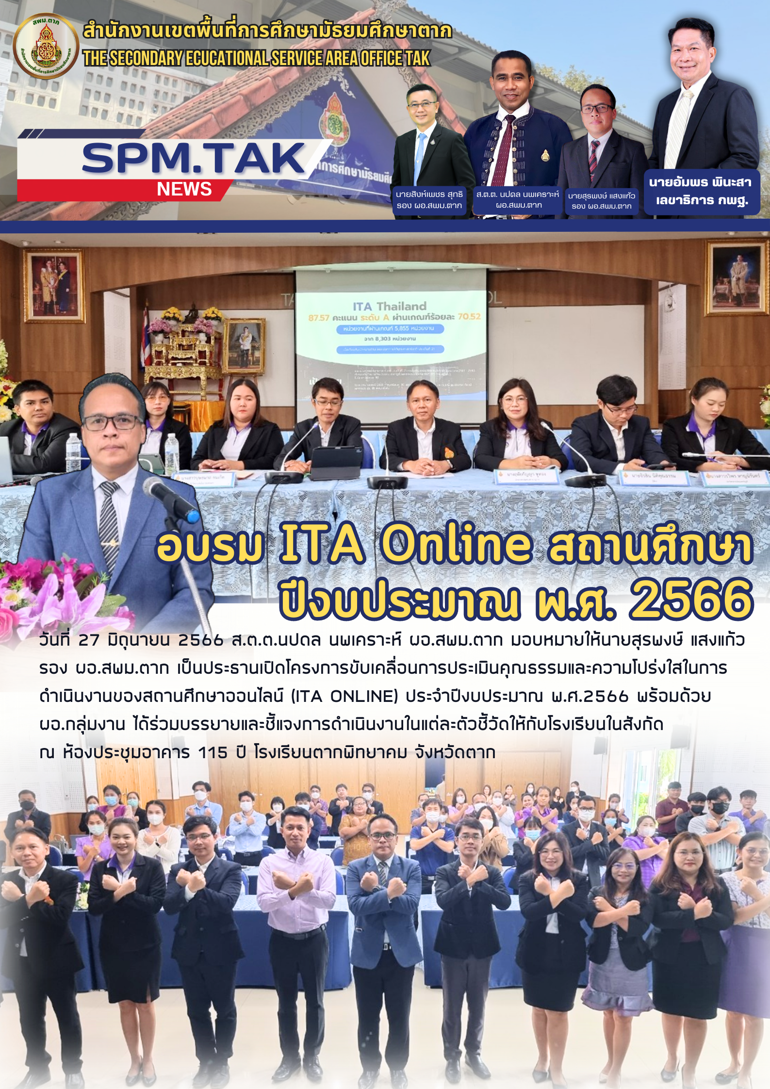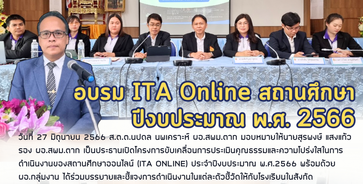 วันที่ 27 มิถุนายน 2566 ส.ต.ต.นปดล นพเคราะห์ ผอ.สพม.ตาก มอบหมายให้นายสุรพงษ์ แสงแก้ว รอง ผอ.สพม.ตาก เป็นประธานเปิดโครงการขับเคลื่อนการประเมินคุณธรรมและความโปร่งใสในการดำเนินงานของสถานศึกษาออนไลน์ (ITA Online) ประจำปีงบประมาณ พ.ศ.2566 พร้อมด้วย ผอ.กลุ่มงาน ได้ร่วมบรรยายและชี้แจงการดำเนินงานในแต่ละตัวชี้วัดให้กับโรงเรียนในสังกัด ณ ห้องประชุมอาคาร 115 ปี โรงเรียนตากพิทยาคม จังหวัดตาก