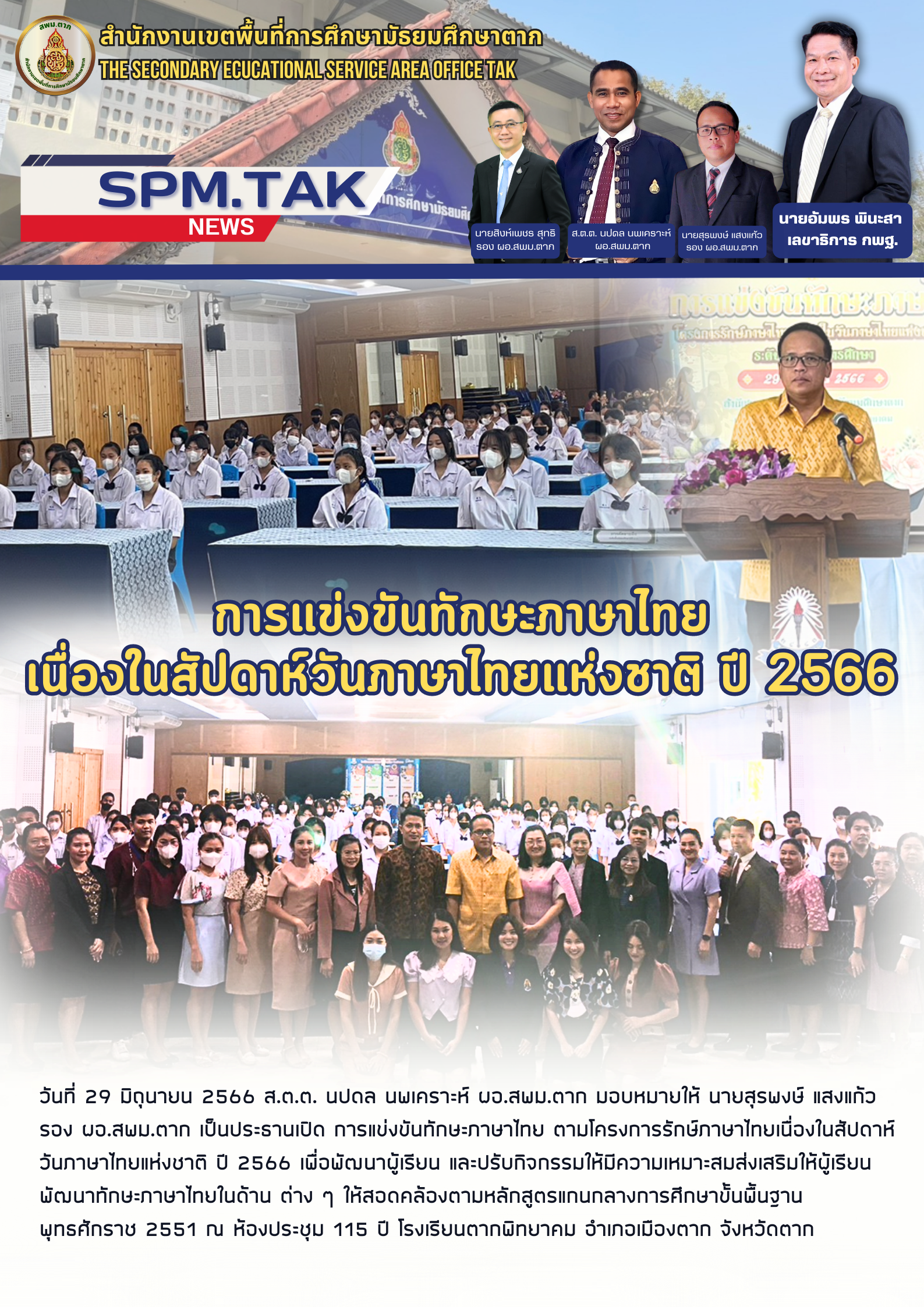 วันที่ 29 มิถุนายน 2566 ส.ต.ต. นปดล นพเคราะห์ ผอ.สพม.ตาก มอบหมายให้ นายสุรพงษ์ แสงแก้ว รอง ผอ.สพม.ตาก เป็นประธานเปิด การแข่งขันทักษะภาษาไทย ตามโครงการรักษ์ภาษาไทยเนื่องในสัปดาห์วันภาษาไทยแห่งชาติ ปี 2566 เพื่อพัฒนาผู้เรียน และปรับกิจกรรมให้มีความเหมาะสมส่งเสริมให้ผู้เรียนพัฒนาทักษะภาษาไทยในด้าน ต่าง ๆ ให้สอดคล้องตามหลักสูตรแกนกลางการศึกษาขั้นพื้นฐาน พุทธศักราช 2551 ณ ห้องประชุม 115 ปี โรงเรียนตากพิทยาคม อำเภอเมืองตาก จังหวัดตาก