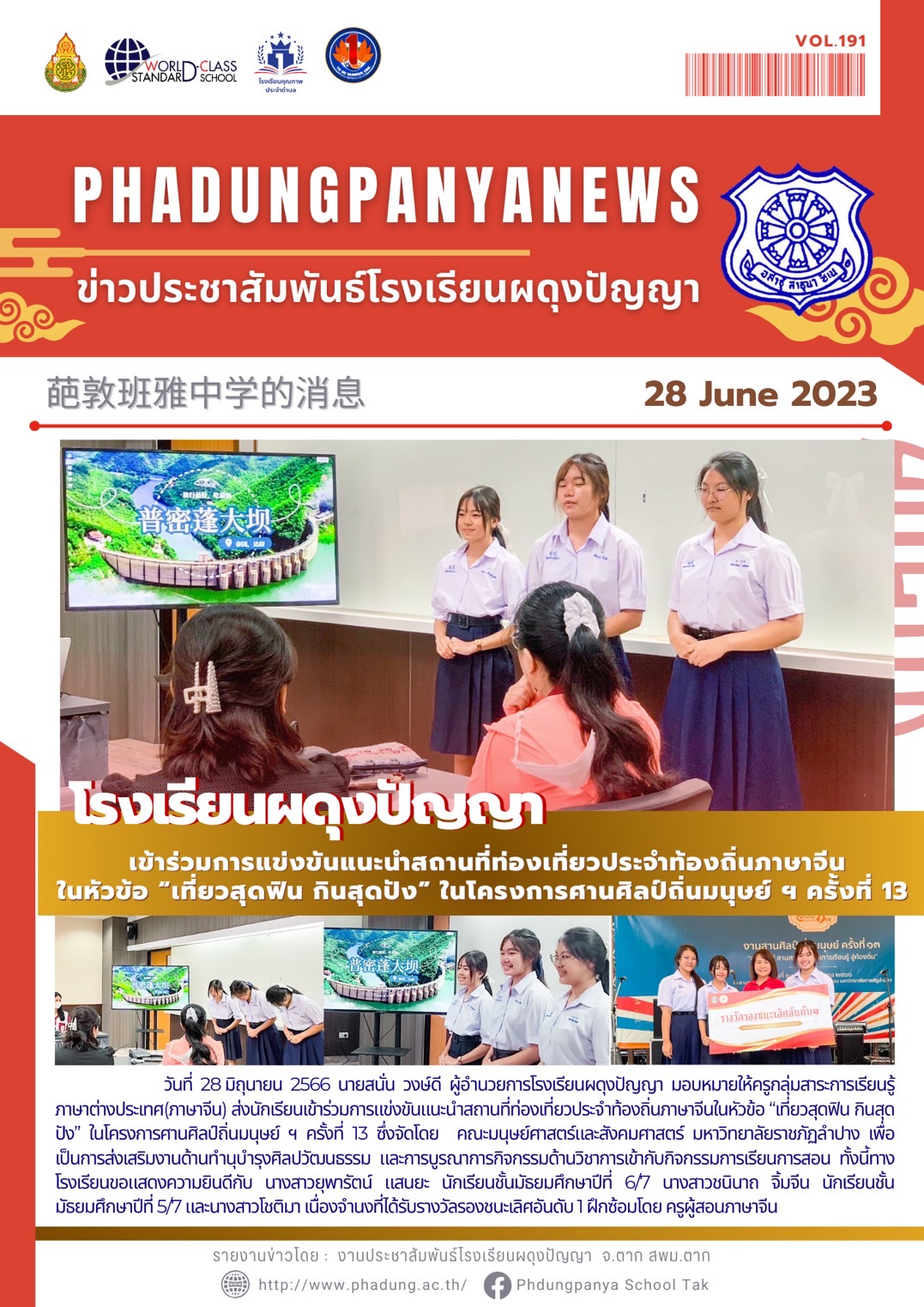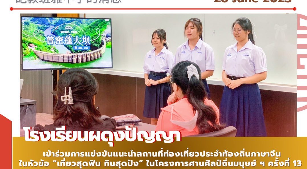 วันที่ 28 มิถุนายน 2566 นายสนั่น วงษ์ดี ผู้อำนวยการโรงเรียนผดุงปัญญา มอบหมายให้กลุ่มสาระการเรียนรู้ภาษาต่างประเทศ(ภาษาจีน) ส่งนักเรียนเข้าร่วมการแข่งขันแนะนำสถานที่ท่องเที่ยวประจำท้องถิ่นภาษาจีนในหัวข้อ “เที่ยวสุดฟิน กินสุดปัง” ในโครงการศานศิลป์ถิ่นมนุษย์ ฯ ครั้งที่ 13 ซึ่งจัดโดย คณะมนุษย์ศาสตร์และสังคมศาสตร์ มหาวิทยาลัยราชภัฏลำปาง เพื่อเป็นการส่งเสริมงานด้านทำนุบำรุงศิลปวัฒนธรรม และการบูรณาการกิจกรรมด้านวิชาการเข้ากับกิจกรรมการเรียนการสอน