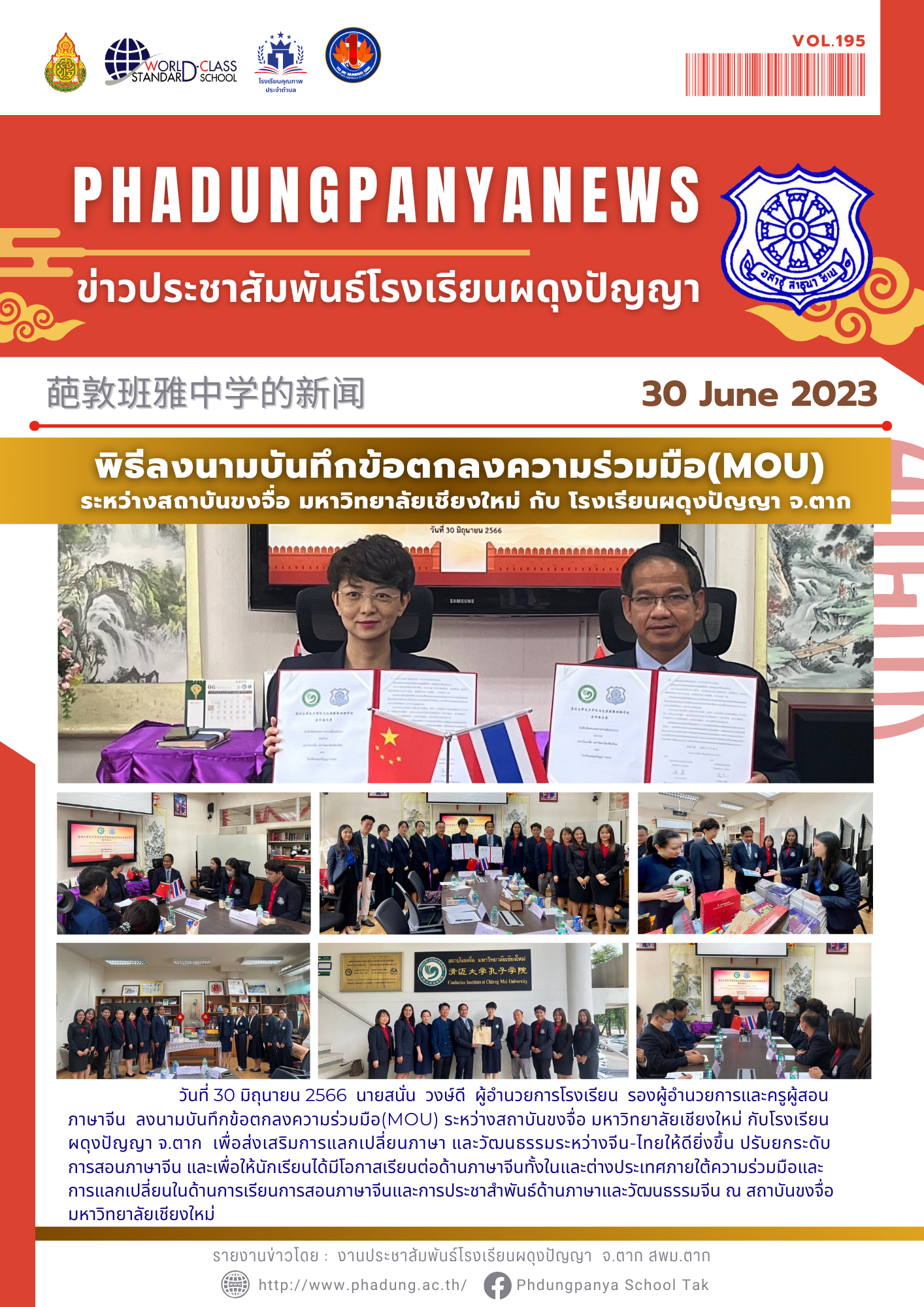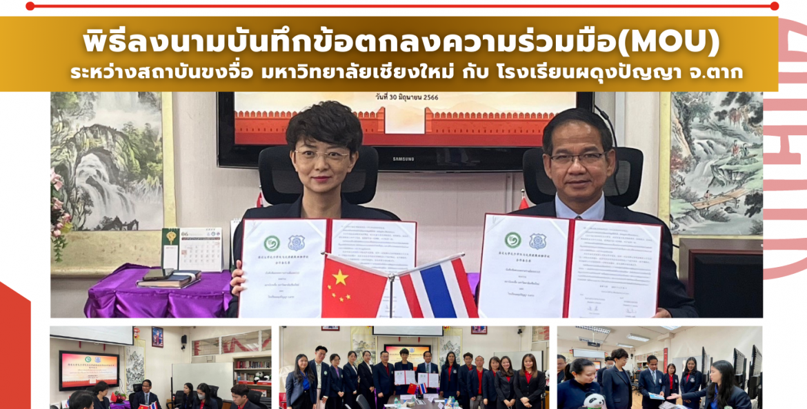 วันที่ 30 มิถุนายน 2566 นายสนั่น วงษ์ดี ผู้อำนวยการโรงเรียน รองผู้อำนวยการและครูผู้สอนภาษาจีน ลงนามบันทึกข้อตกลงความร่วมมือ(MOU) ระหว่างสถาบันขงจื่อ มหาวิทยาลัยเชียงใหม่ กับโรงเรียนผดุงปัญญา จ.ตาก เพื่อส่งเสริมการแลกเปลี่ยนภาษา และวัฒนธรรมระหว่างจีน-ไทยให้ดียิ่งขึ้น ปรับยกระดับการสอนภาษาจีน และเพื่อให้นักเรียนได้มีโอกาสเรียนต่อด้านภาษาจีนทั้งในและต่างประเทศภายใต้ความร่วมมือและการแลกเปลี่ยนในด้านการเรียนการสอนภาษาจีนและการประชาสำพันธ์ด้านภาษาและวัฒนธรรมจีน ณ สถาบันขงจื่อมหาวิทยาลัยเชียงใหม่