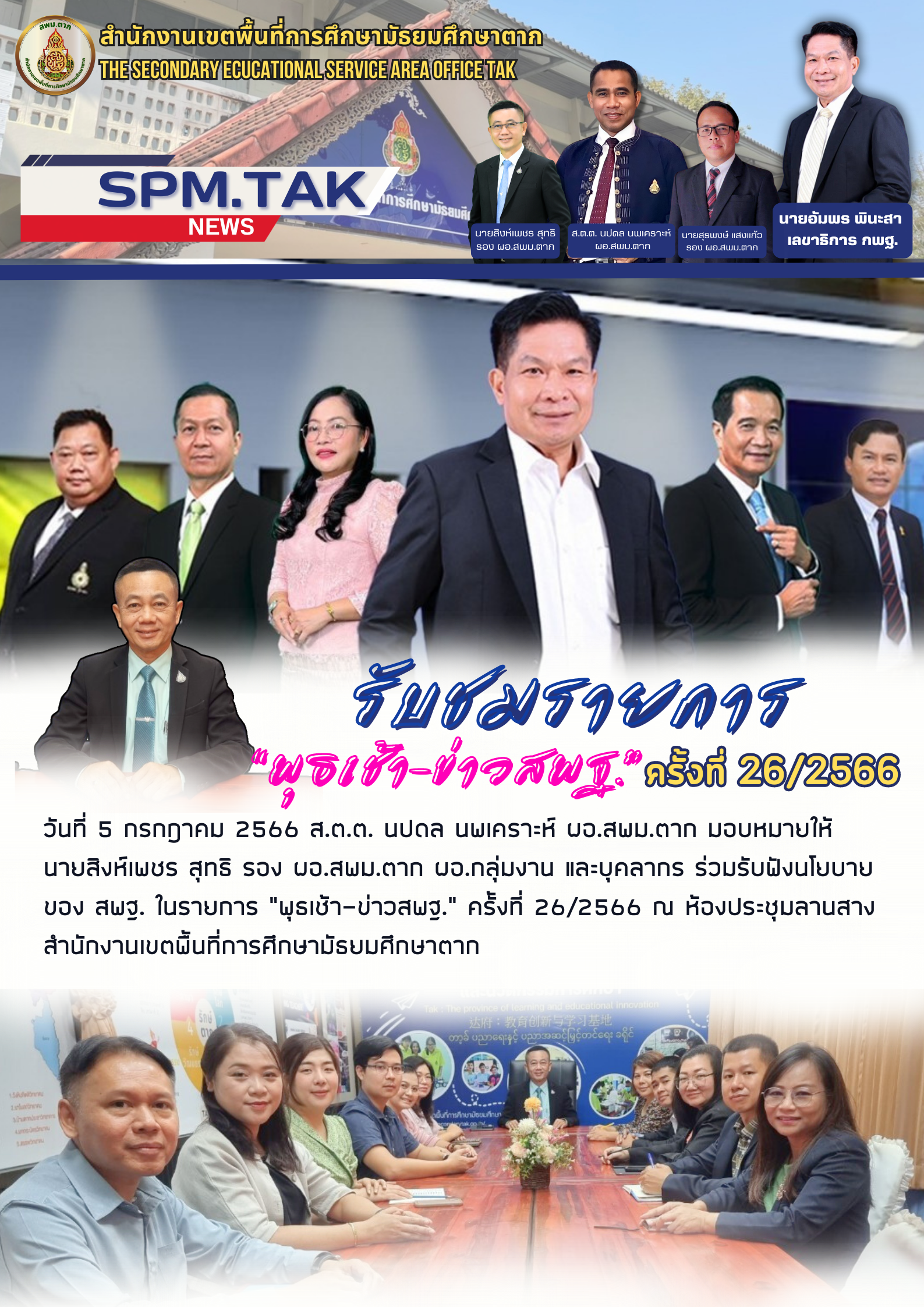 วันที่ 5 กรกฎาคม 2566 ส.ต.ต. นปดล นพเคราะห์ ผอ.สพม.ตาก มอบหมายให้ นายสิงห์เพชร สุทธิ รอง ผอ.สพม.ตาก ผอ.กลุ่มงาน และบุคลากร ร่วมรับฟังนโยบาย ของ สพฐ. ในรายการ “พุธเช้า–ข่าวสพฐ.” ครั้งที่ 26/2566 ณ ห้องประชุมลานสาง สำนักงานเขตพื้นที่การศึกษามัธยมศึกษาตาก