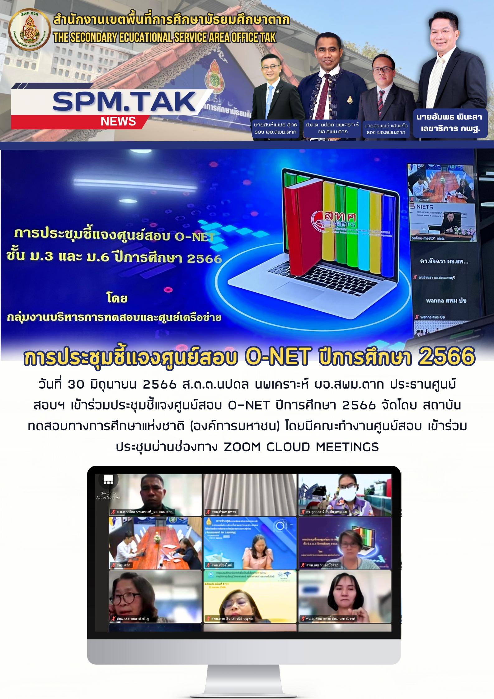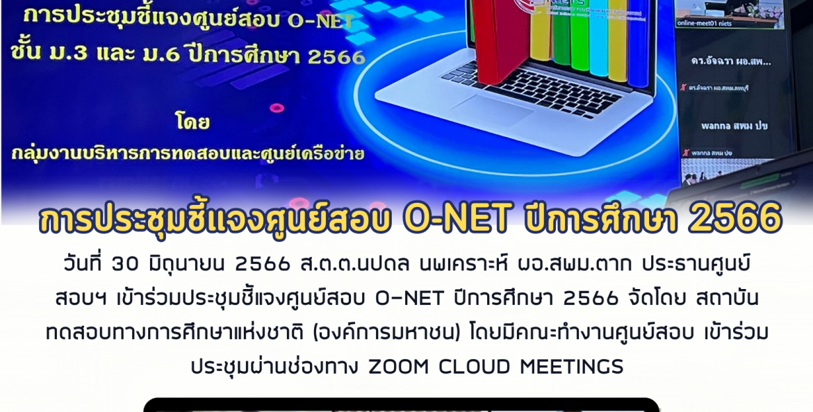 การประชุมชี้แจงศูนย์สอบ O-NET ปีการศึกษา 2566 วรวุฒิ เนื้อนิ่ม 1 กรกฎาคม 2566 วันที่ 30 มิถุนายน 2566 ส.ต.ต.นปดล นพเคราะห์ ผอ.สพม.ตาก ประธานศูนย์สอบฯ เข้าร่วมประชุมชี้แจงศูนย์สอบ O-NET ปีการศึกษา 2566 จัดโดย สถาบันทดสอบทางการศึกษาแห่งชาติ (องค์การมหาชน) โดยมีคณะทำงานศูนย์สอบ เข้าร่วมประชุมผ่านช่องทาง Zoom Cloud Meetings จำนวนคนดู 1