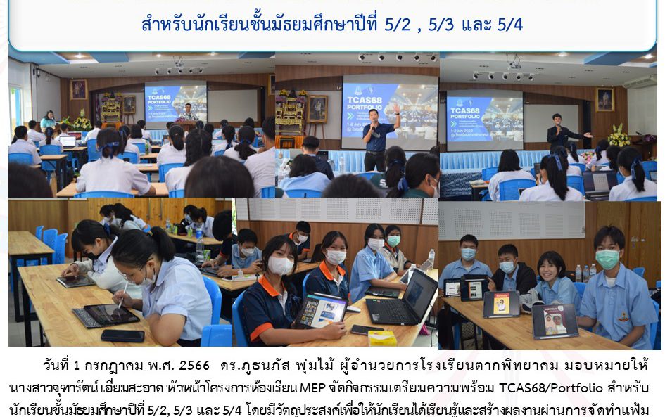 วันที่ 1 กรกฎาคม พ.ศ. 2566 ดร.ภูธนภัส พุ่มไม้ ผู้อำนวยการโรงเรียนตากพิทยาคม มอบหมายให้นางสาวจุฑารัตน์ เอี่ยมสะอาด หัวหน้าโครงการห้องเรียน MEP จัดกิจกรรมเตรียมความพร้อม TCAS68/Portfolio สำหรับนักเรียนชั้นมัธยมศึกษาปีที่ 5/2, 5/3 และ 5/4 โดยมีวัตถุประสงค์เพื่อให้นักเรียนได้เรียนรู้และสร้างผลงานผ่านการจัดทำแฟ้มสะสมผลงาน (Portfolio) เรียนรู้โปรแกรมคอมพิวเตอร์ที่สำคัญในการจัดทำและเผยแพร่ผลงานของตนเอง ระหว่างวันที่ 1-2 กรกฎาคม พ.ศ. 2566 ณ ห้องประชุม 115 ปี โรงเรียนตากพิทยาคม