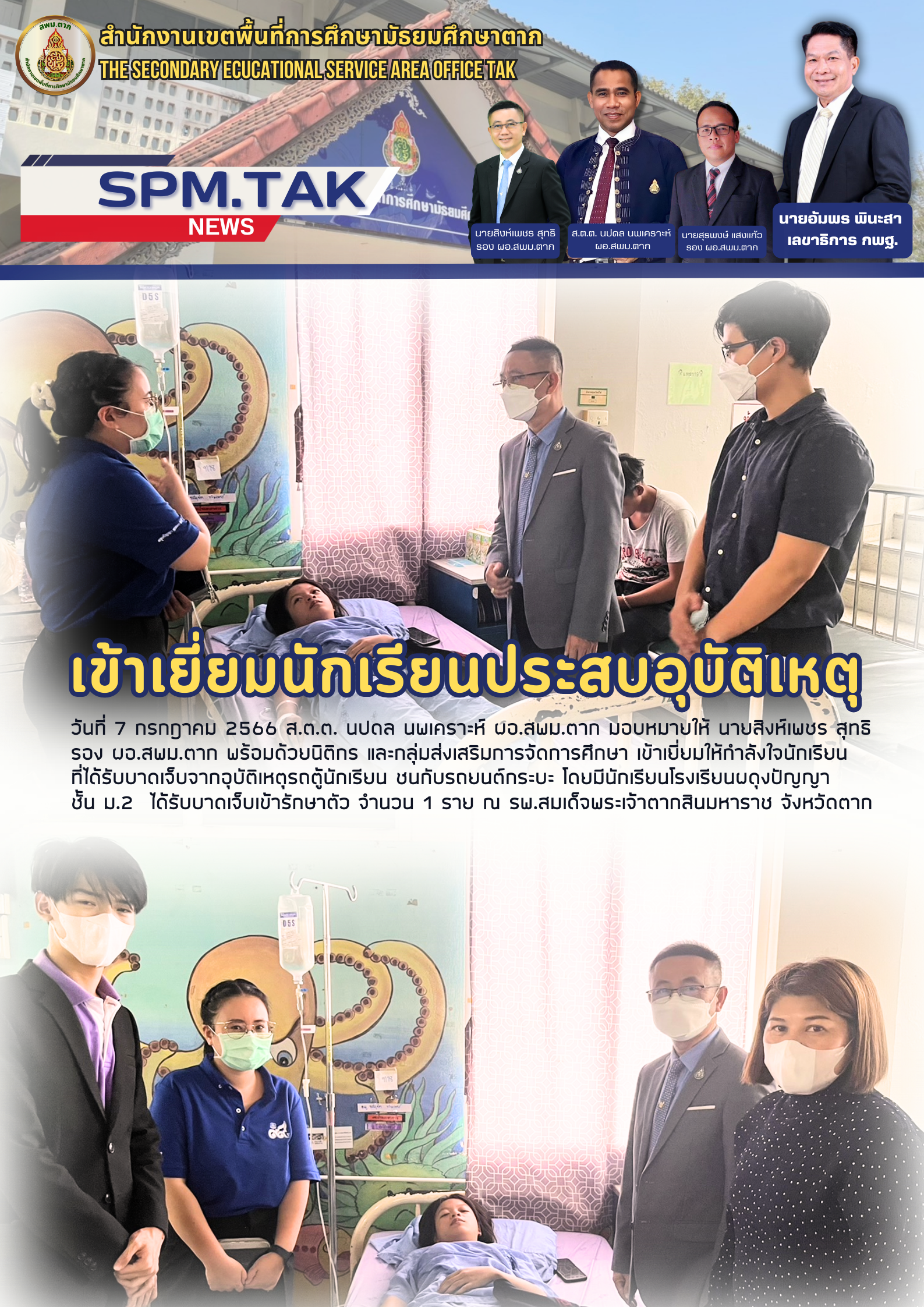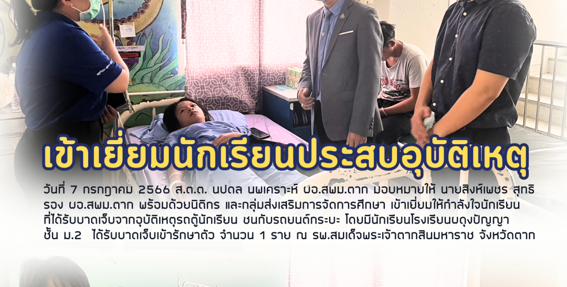 วันที่ 7 กรกฎาคม 2566 ส.ต.ต. นปดล นพเคราะห์ ผอ.สพม.ตาก มอบหมายให้ นายสิงห์เพชร สุทธิ รอง ผอ.สพม.ตาก พร้อมด้วยนิติกร และกลุ่มส่งเสริมการจัดการศึกษา เข้าเยี่ยมให้กำลังใจนักเรียน ที่ได้รับบาดเจ็บจากอุบัติเหตุรถตู้นักเรียน ชนกับรถยนต์กระบะ โดยมีนักเรียนโรงเรียนผดุงปัญญา ชั้น ม.2 ได้รับบาดเจ็บเข้ารักษาตัว จำนวน 1 ราย ณ รพ.สมเด็จพระเจ้าตากสินมหาราช จังหวัดตาก