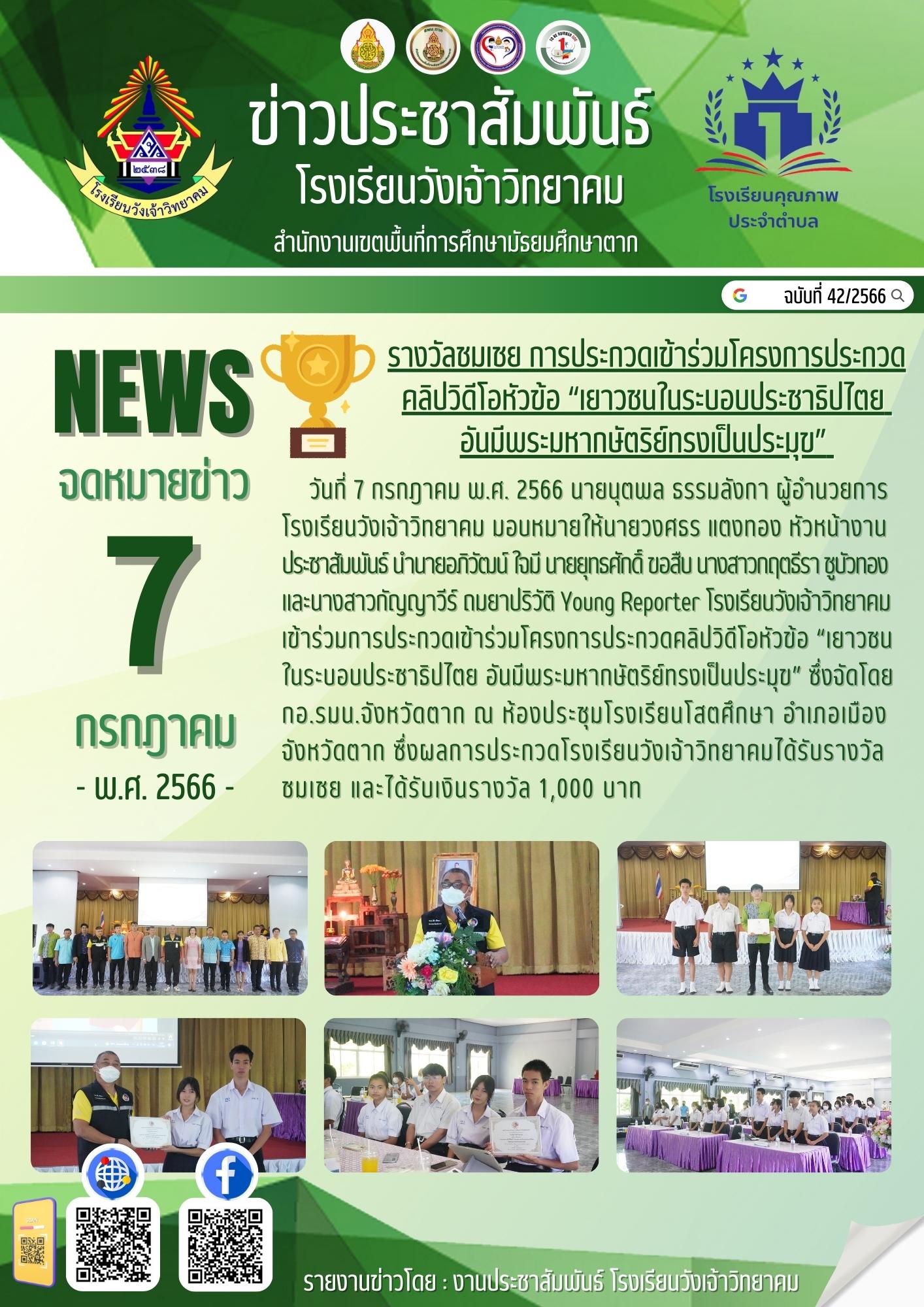 โรงเรียนวังเจ้าวิทยาคม รางวัลชมเชย การประกวดเข้าร่วมโครงการประกวดคลิปวิดีโอหัวข้อ “เยาวชนในระบอบประชาธิปไตย อันมีพระมหากษัตริย์ทรงเป็นประมุข” วงศธร แตงทอง 8 กรกฎาคม 2566 จำนวนคนดู 4
