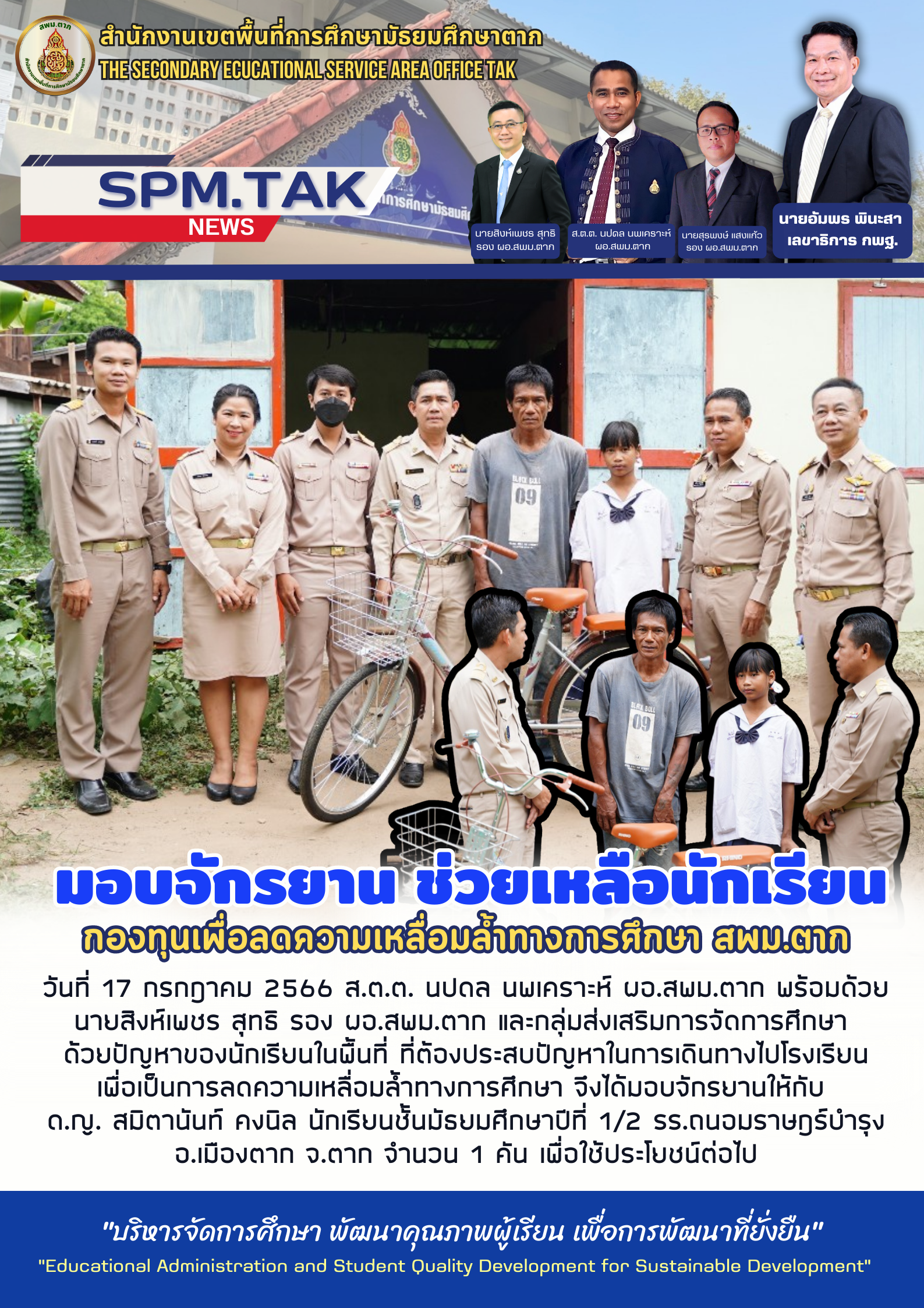 วันที่ 17 กรกฎาคม 2566 ส.ต.ต. นปดล นพเคราะห์ ผอ.สพม.ตาก พร้อมด้วย นายสิงห์เพชร สุทธิ รอง ผอ.สพม.ตาก และกลุ่มส่งเสริมการจัดการศึกษา ด้วยปัญหาของนักเรียนในพื้นที่ ที่ต้องประสบปัญหาในการเดินทางไปโรงเรียน เพื่อเป็นการลดความเหลื่อมล้ำทางการศึกษา จึงได้มอบจักรยานให้กับ ด.ญ. สมิตานันท์ คงนิล นักเรียนชั้นมัธยมศึกษาปีที่ 1/2 รร.ถนอมราษฎร์บำรุง อ.เมืองตาก จ.ตาก จำนวน 1 คัน เพื่อใช้ประโยชน์ต่อไป