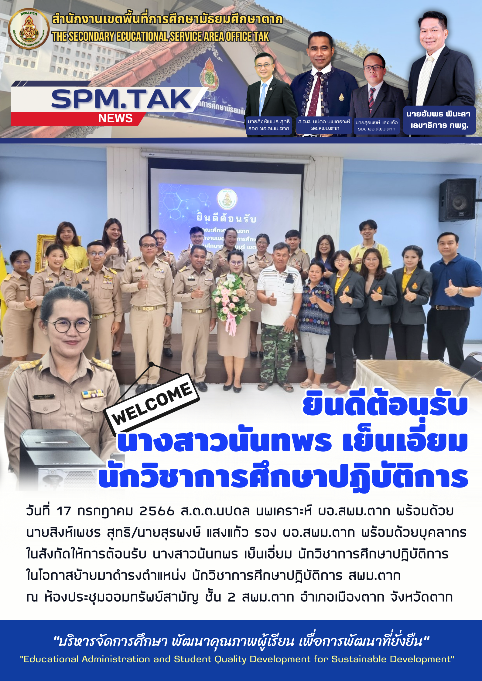 วันที่ 17 กรกฎาคม 2566 ส.ต.ต.นปดล นพเคราะห์ ผอ.สพม.ตาก พร้อมด้วย นายสิงห์เพชร สุทธิ/นายสุรพงษ์ แสงแก้ว รอง ผอ.สพม.ตาก พร้อมด้วยบุคลากรในสังกัดให้การต้อนรับ นางสาวนันทพร เย็นเอี่ยม นักวิชาการศึกษาปฏิบัติการ ในโอกาสย้ายมาดำรงตำแหน่ง นักวิชาการศึกษาปฏิบัติการ สพม.ตาก ณ ห้องประชุมออมทรัพย์สามัญ ชั้น 2 สพม.ตาก อำเภอเมืองตาก จังหวัดตาก