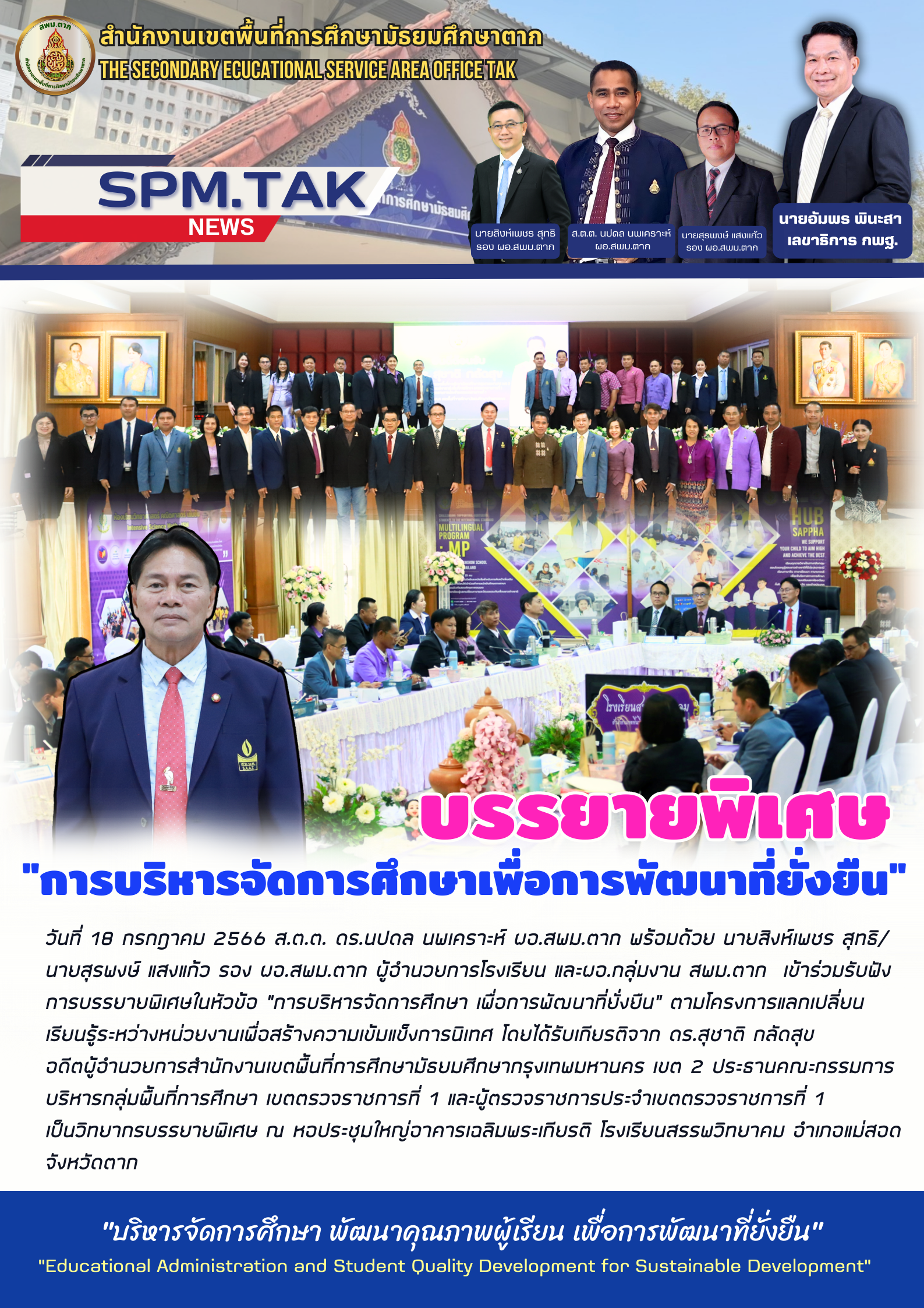 วันที่ 18 กรกฎาคม 2566 ส.ต.ต. ดร.นปดล นพเคราะห์ ผอ.สพม.ตาก พร้อมด้วย นายสิงห์เพชร สุทธิ/นายสุรพงษ์ แสงแก้ว รอง ผอ.สพม.ตาก ผู้อำนวยการโรงเรียน และผอ.กลุ่มงาน สพม.ตาก เข้าร่วมรับฟัง การบรรยายพิเศษในหัวข้อ “การบริหารจัดการศึกษา เพื่อการพัฒนาที่ยั่งยืน” ตามโครงการแลกเปลี่ยน เรียนรู้ระหว่างหน่วยงานเพื่อสร้างความเข้มแข็งการนิเทศ โดยได้รับเกียรติจาก ดร.สุชาติ กลัดสุข อดีตผู้อำนวยการสำนักงานเขตพื้นที่การศึกษามัธยมศึกษากรุงเทพมหานคร เขต 2 ประธานคณะกรรมการบริหารกลุ่มพื้นที่การศึกษา เขตตรวจราชการที่ 1 และผู้ตรวจราชการประจำเขตตรวจราชการที่ 1 เป็นวิทยากรบรรยายพิเศษ ณ หอประชุมใหญ่อาคารเฉลิมพระเกียรติ โรงเรียนสรรพวิทยาคม อำเภอแม่สอด จังหวัดตาก
