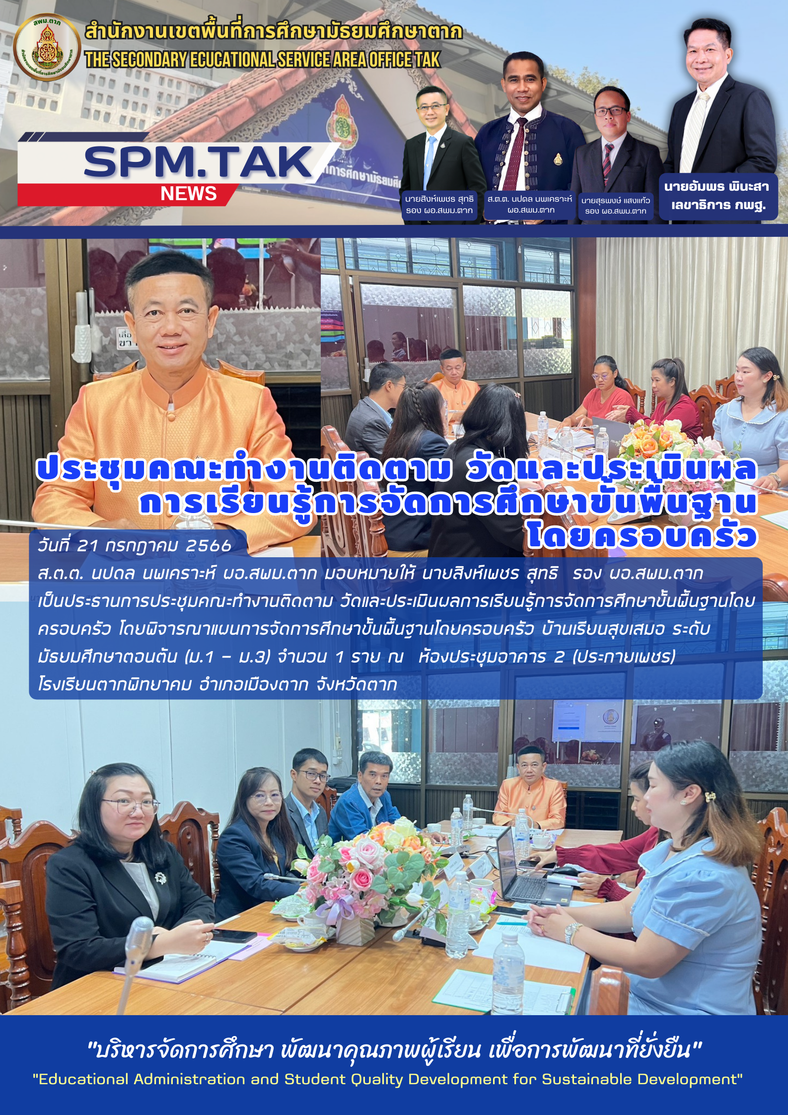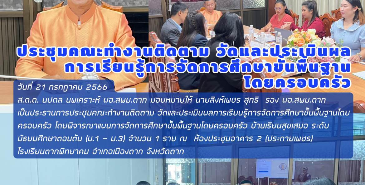 วันที่ 21 กรกฎาคม 2566 ส.ต.ต. นปดล นพเคราะห์ ผอ.สพม.ตาก มอบหมายให้ นายสิงห์เพชร สุทธิ รอง ผอ.สพม.ตาก เป็นประธานการประชุมคณะทำงานติดตาม วัดและประเมินผลการเรียนรู้การจัดการศึกษาขั้นพื้นฐานโดยครอบครัว โดยพิจารณาแผนการจัดการศึกษาขั้นพื้นฐานโดยครอบครัว บ้านเรียนสุขเสมอ ระดับ มัธยมศึกษาตอนต้น (ม.1 – ม.3) จำนวน 1 ราย ณ ห้องประชุมอาคาร 2 (ประกายเพชร) โรงเรียนตากพิทยาคม อำเภอเมืองตาก จังหวัดตาก