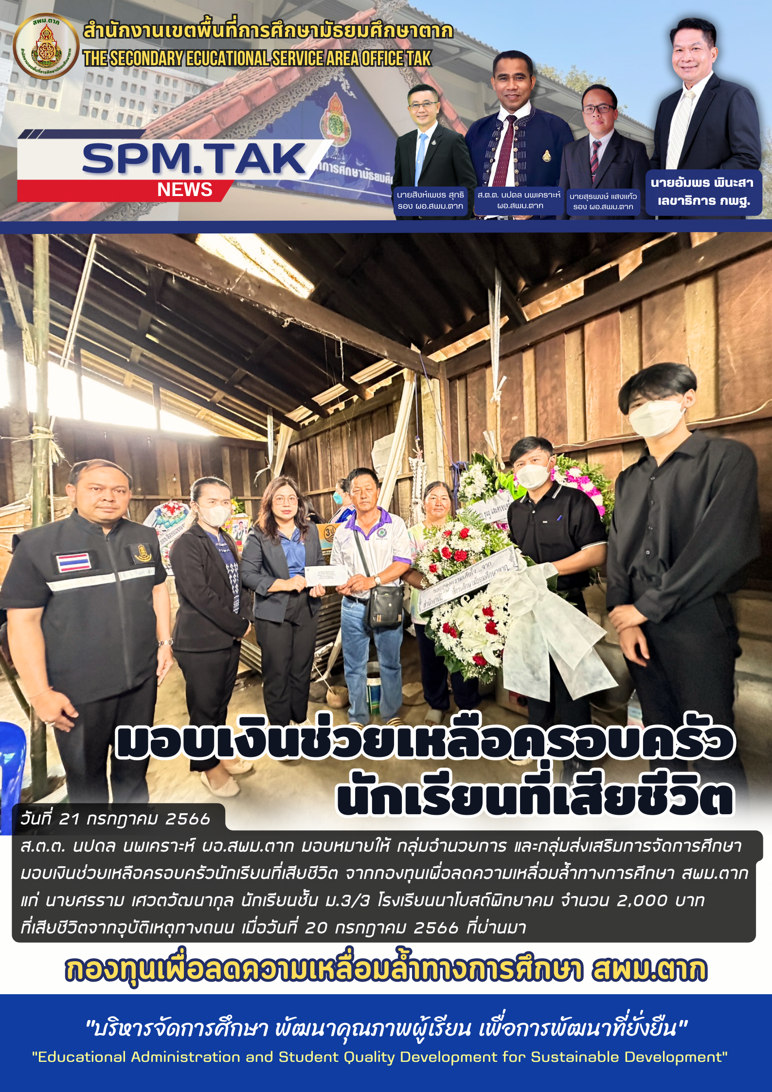 วันที่ 21 กรกฎาคม 2566 ส.ต.ต. นปดล นพเคราะห์ ผอ.สพม.ตาก มอบหมายให้ กลุ่มอำนวยการ และกลุ่มส่งเสริมการจัดการศึกษา มอบเงินช่วยเหลือครอบครัวนักเรียนที่เสียชีวิต จากกองทุนเพื่อลดความเหลื่อมล้ำทางการศึกษา สพม.ตาก แก่ นายศรราม เศวตวัฒนากุล นักเรียนชั้น ม.3/3 โรงเรียนนาโบสถ์พิทยาคม จำนวน 2,000 บาท ที่เสียชีวิตจากอุบัติเหตุทางถนน เมื่อวันที่ 20 กรกฎาคม 2566 ที่ผ่านมา
