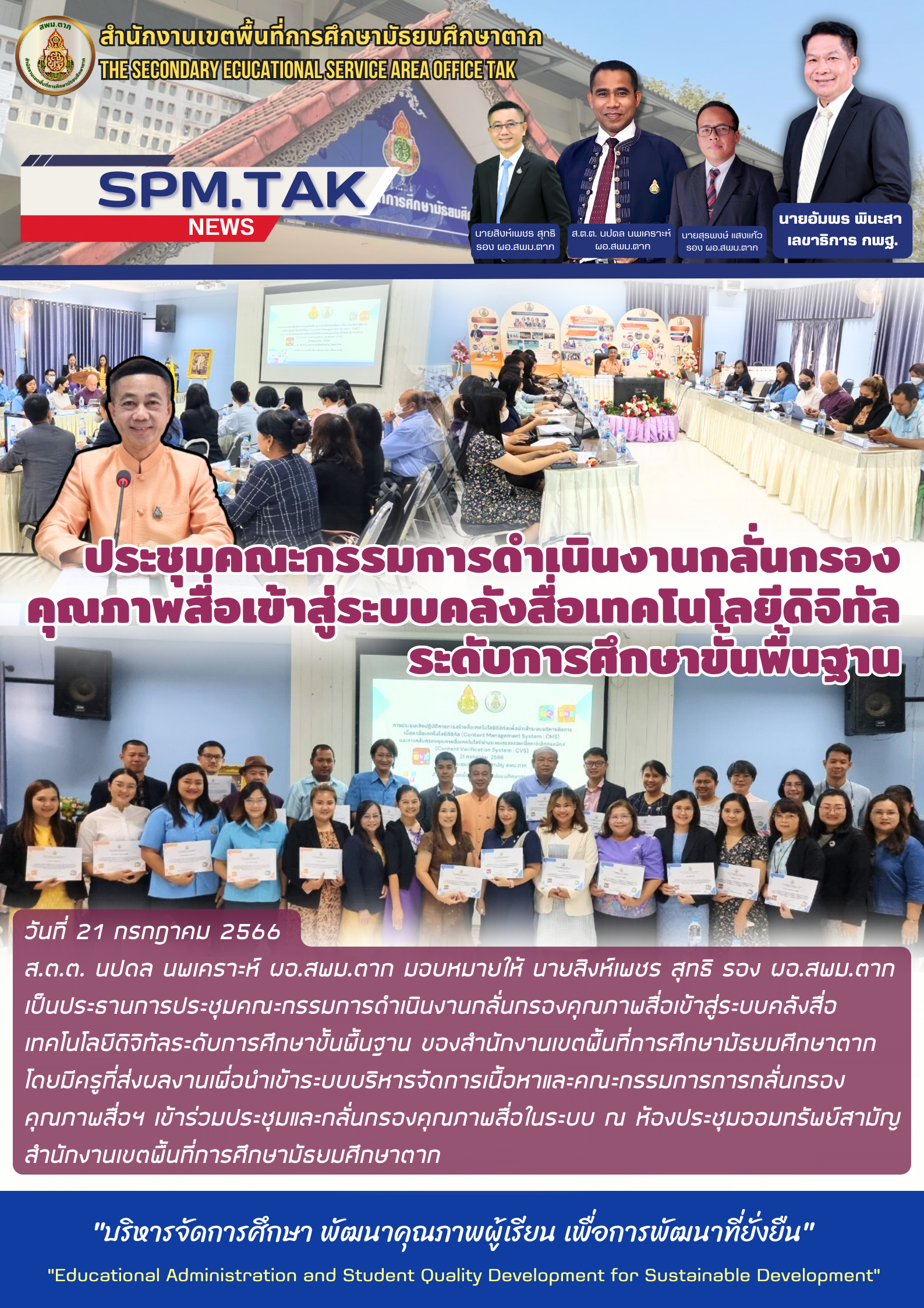 วันที่ 21 กรกฎาคม 2566 ส.ต.ต. นปดล นพเคราะห์ ผอ.สพม.ตาก มอบหมายให้ นายสิงห์เพชร สุทธิ รอง ผอ.สพม.ตาก เป็นประธานการประชุมคณะกรรมการดำเนินงานกลั่นกรองคุณภาพสื่อเข้าสู่ระบบคลังสื่อ เทคโนโลยีดิจิทัลระดับการศึกษาขั้นพื้นฐาน ของสำนักงานเขตพื้นที่การศึกษามัธยมศึกษาตาก โดยมีครูที่ส่งผลงานเพื่อนำเข้าระบบบริหารจัดการเนื้อหาและคณะกรรมการการกลั่นกรอง คุณภาพสื่อฯ เข้าร่วมประชุมและกลั่นกรองคุณภาพสื่อในระบบ ณ ห้องประชุมออมทรัพย์สามัญ สำนักงานเขตพื้นที่การศึกษามัธยมศึกษาตาก