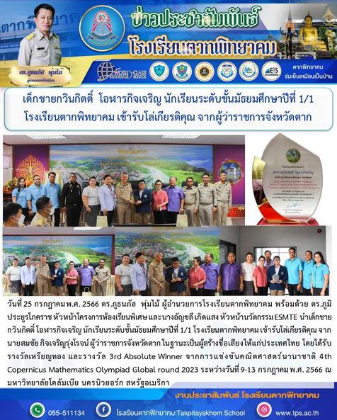 วันที่ 25 กรกฎาคม พ.ศ. 2566 ดร.ภูธนภัส พุ่มไม้ ผู้อำนวยการโรงเรียนตากพิทยาคม พร้อมด้วย ดร.ภูมิ ประยูรโภคราช หัวหน้าโครงการห้องเรียนพิเศษ และนางอัญชลี เกิดแสง หัวหน้านวัตกรรม ESMTE นำเด็กชายกวินกิตติ์ โอฬารกิจเจริญ นักเรียนระดับชั้นมัธยมศึกษาปีที่ 1/1 โรงเรียนตากพิทยาคม เข้ารับโล่เกียรติคุณ จากนายสมชัย กิจเจริญรุ่งโรจน์ ผู้ว่าราชการจังหวัดตาก ในฐานะเป็นผู้สร้างชื่อเสียงให้แก่ประเทศไทย โดยได้รับรางวัลเหรียญทอง และรางวัล 3rd Absolute Winner จากการแข่งขันคณิตศาสตร์นานาชาติ 4th Copernicus Mathematics Olympiad Global round 2023 ระหว่างวันที่ 9-13 กรกฎาคม พ.ศ. 2566 ณ มหาวิทยาลัยโคลัมเบีย นครนิวยอร์ก สหรัฐอเมริกา