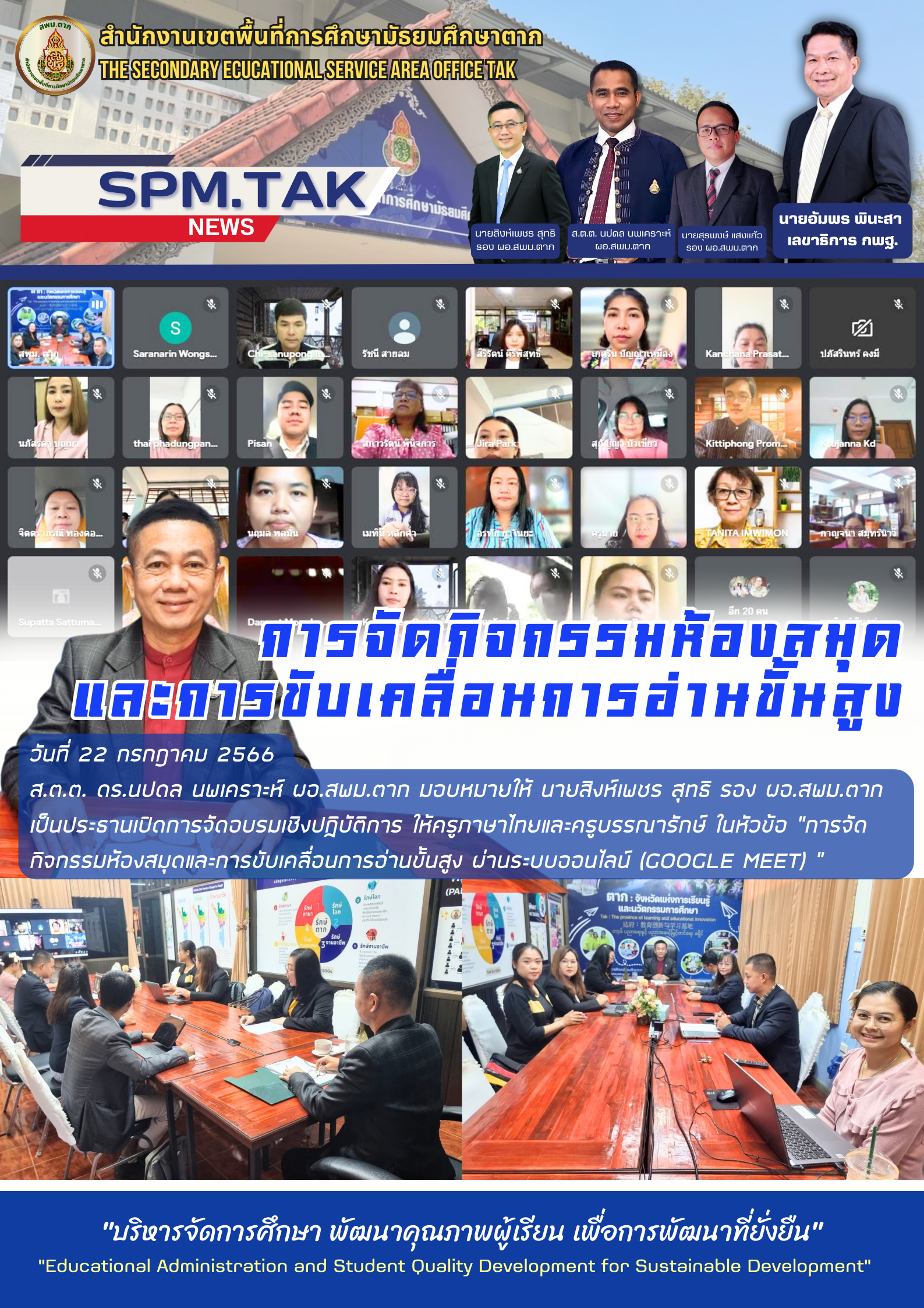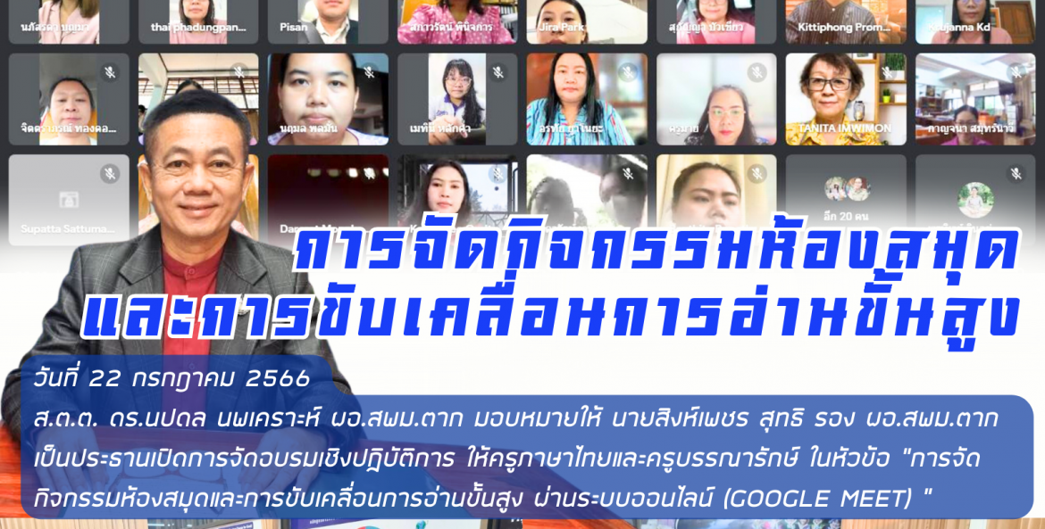 วันที่ 22 กรกฎาคม 2566 ส.ต.ต. ดร.นปดล นพเคราะห์ ผอ.สพม.ตาก มอบหมายให้ นายสิงห์เพชร สุทธิ รอง ผอ.สพม.ตาก เป็นประธานเปิดการจัดอบรมเชิงปฏิบัติการ ให้ครูภาษาไทยและครูบรรณารักษ์ ในหัวข้อ “การจัด กิจกรรมห้องสมุดและการขับเคลื่อนการอ่านขั้นสูง ผ่านระบบออนไลน์ (Google Meet) ”
