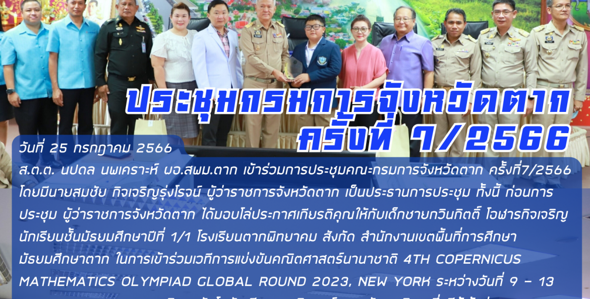 วันที่ 25 กรกฎาคม 2566 ส.ต.ต. นปดล นพเคราะห์ ผอ.สพม.ตาก เข้าร่วมการประชุมคณะกรมการจังหวัดตาก ครั้งที่7/2566 โดยมีนายสมชัย กิจเจริญรุ่งโรจน์ ผู้ว่าราชการจังหวัดตาก เป็นประธานการประชุม ทั้งนี้ ก่อนการ ประชุม ผู้ว่าราชการจังหวัดตาก ได้มอบโล่ประกาศเกียรติคุณให้กับเด็กชายกวินกิตติ์ โอฬารกิจเจริญ นักเรียนชั้นมัธยมศึกษาปีที่ 1/1 โรงเรียนตากพิทยาคม สังกัด สำนักงานเขตพื้นที่การศึกษา มัธยมศึกษาตาก ในการเข้าร่วมเวทีการแข่งขันคณิตศาสตร์นานาชาติ 4th Copernicus Mathematics Olympiad Global round 2023, New York ระหว่างวันที่ 9 – 13 กรกฎาคม 2566 ณ มหาวิทยาลัยโคลัมเบีย นครนิวยอร์ก สหรัฐอเมริกา ซึ่งมีผู้เข้าร่วมจาก 23 ประเทศทั่วโลก ได้รับรางวัลเหรียญทอง และรางวัลพิเศษ 3rd Absolute Winner (รางวัล คะแนนรวมสูงสุดอันดับที่ 3) ณ ห้องประชุมตากสินมหาราช ชั้น 5 ศาลากลางจังหวัดตาก