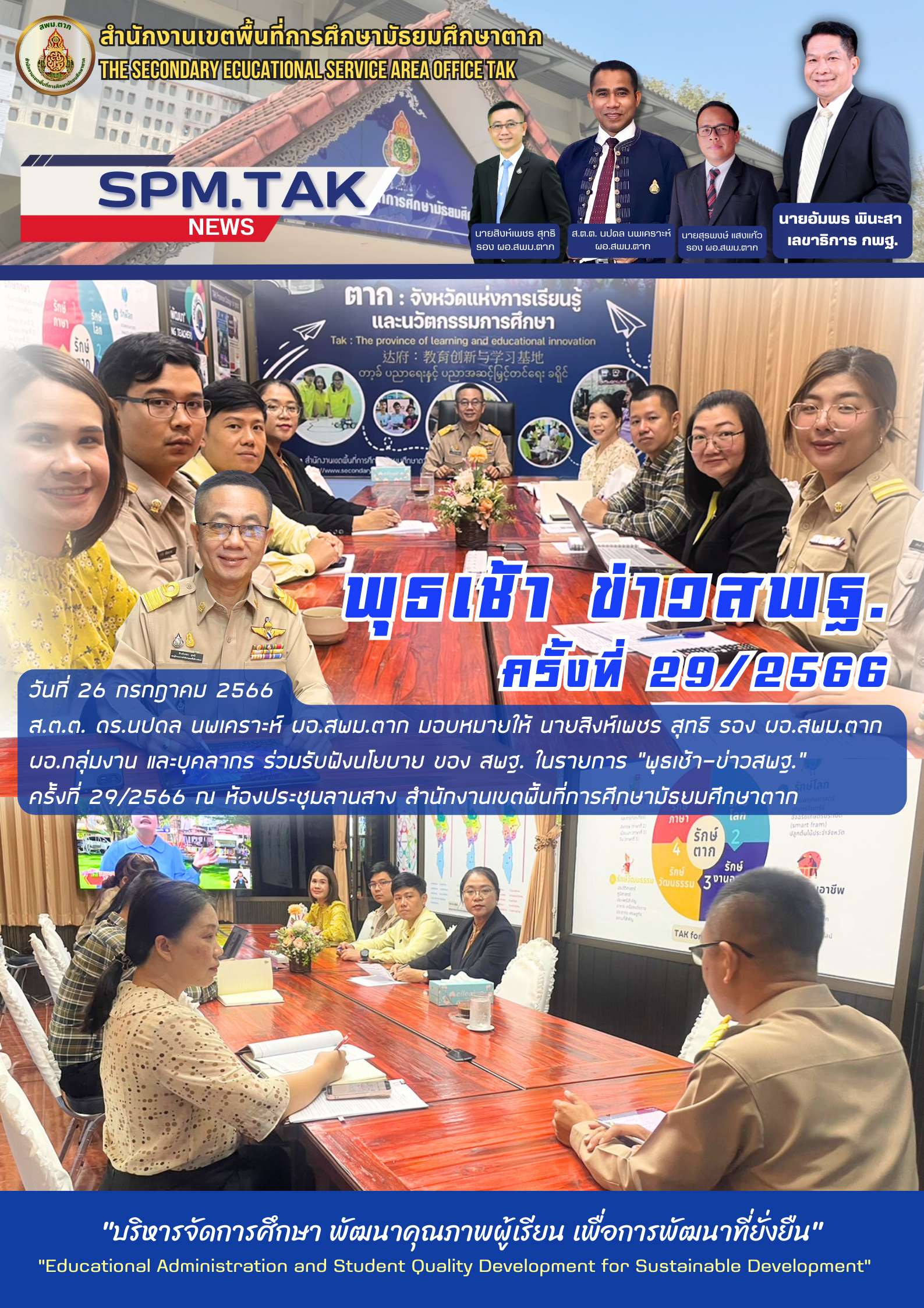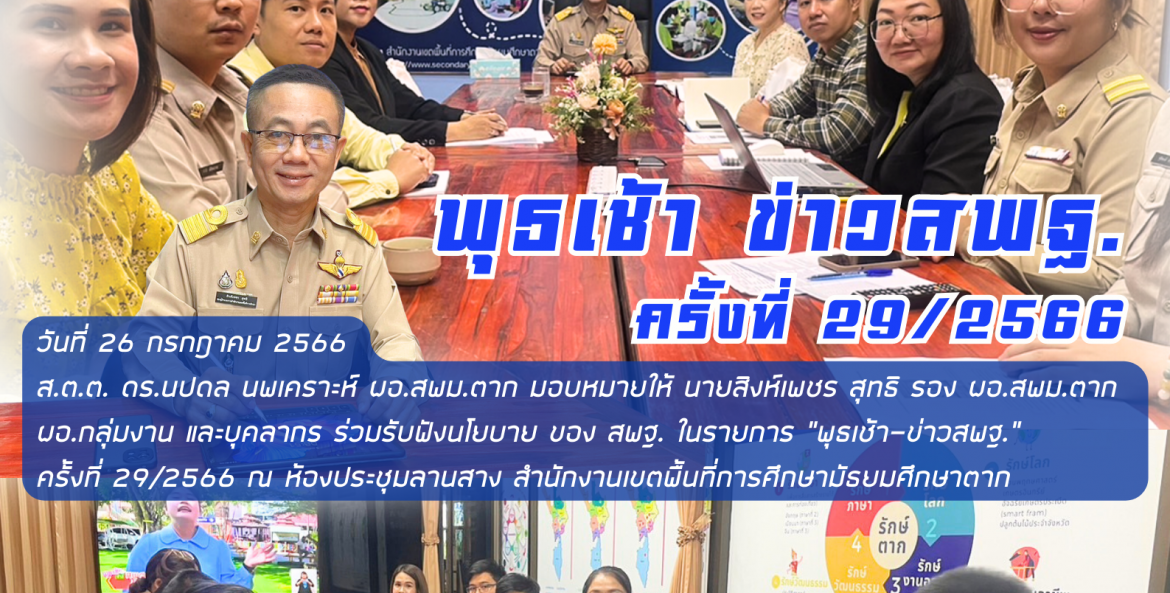 วันที่ 26 กรกฎาคม 2566 ส.ต.ต. ดร.นปดล นพเคราะห์ ผอ.สพม.ตาก มอบหมายให้ นายสิงห์เพชร สุทธิ รอง ผอ.สพม.ตาก ผอ.กลุ่มงาน และบุคลากร ร่วมรับฟังนโยบาย ของ สพฐ. ในรายการ “พุธเช้า–ข่าวสพฐ.” ครั้งที่ 29/2566 ณ ห้องประชุมลานสาง สำนักงานเขตพื้นที่การศึกษามัธยมศึกษาตาก