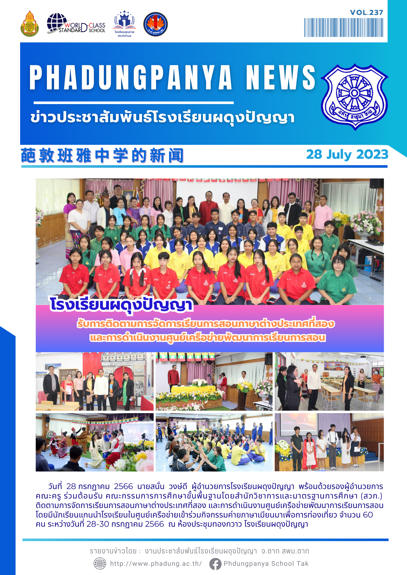 วันที่ 28 กรกฏาคม 2566 นายสนั่น วงษ์ดี ผู้อำนวยการโรงเรียนผดุงปัญญา พร้อมด้วยรองผู้อำนวยการ คณะครู ร่วมต้อนรับ คณะกรรมการการศึกษาขั้นพื้นฐานโดยสำนักวิชาการและมาตรฐานการศึกษา (สวก.) ติดตามการจัดการเรียนการสอนภาษาต่างประเทศที่สอง และการดำเนินงานศูนย์เครือข่ายพัฒนาการเรียนการสอน โดยมีนักเรียนแกนนำโรงเรียนในศูนย์เครือข่ายเข้าร่วมกิจกรรมค่ายภาษาเมียนมาเพื่อการท่องเที่ยว จำนวน 60 คน ระหว่างวันที่ 28-30 กรกฏาคม 2566 ณ ห้องประชุมทองกวาว โรงเรียนผดุงปัญญา