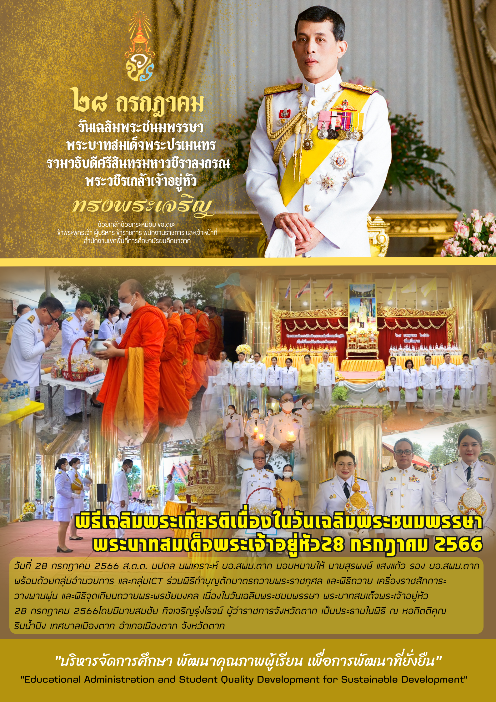 วันที่ 28 กรกฎาคม 2566 ส.ต.ต. นปดล นพเคราะห์ ผอ.สพม.ตาก มอบหมายให้ นายสุรพงษ์ แสงแก้ว รอง ผอ.สพม.ตาก พร้อมด้วยกลุ่มอำนวยการ และกลุ่มICT ร่วมพิธีทำบุญตักบาตรถวายพระราชกุศล และพิธีถวาย เครื่องราชสักการะ วางพานพุ่น และพิธีจุดเทียนถวายพระพรชัยมงคล เนื่องในวันเฉลิมพระชนมพรรษา พระบาทสมเด็จพระเจ้าอยู่หัว 28 กรกฎาคม 2566โดยมีนายสมชัย กิจเจริญรุ่งโรจน์ ผู้ว่าราชการจังหวัดตาก เป็นประธานในพิธี ณ หอกิตติคุณ ริมน้ำปิง เทศบาลเมืองตาก อำเภอเมืองตาก จังหวัดตาก