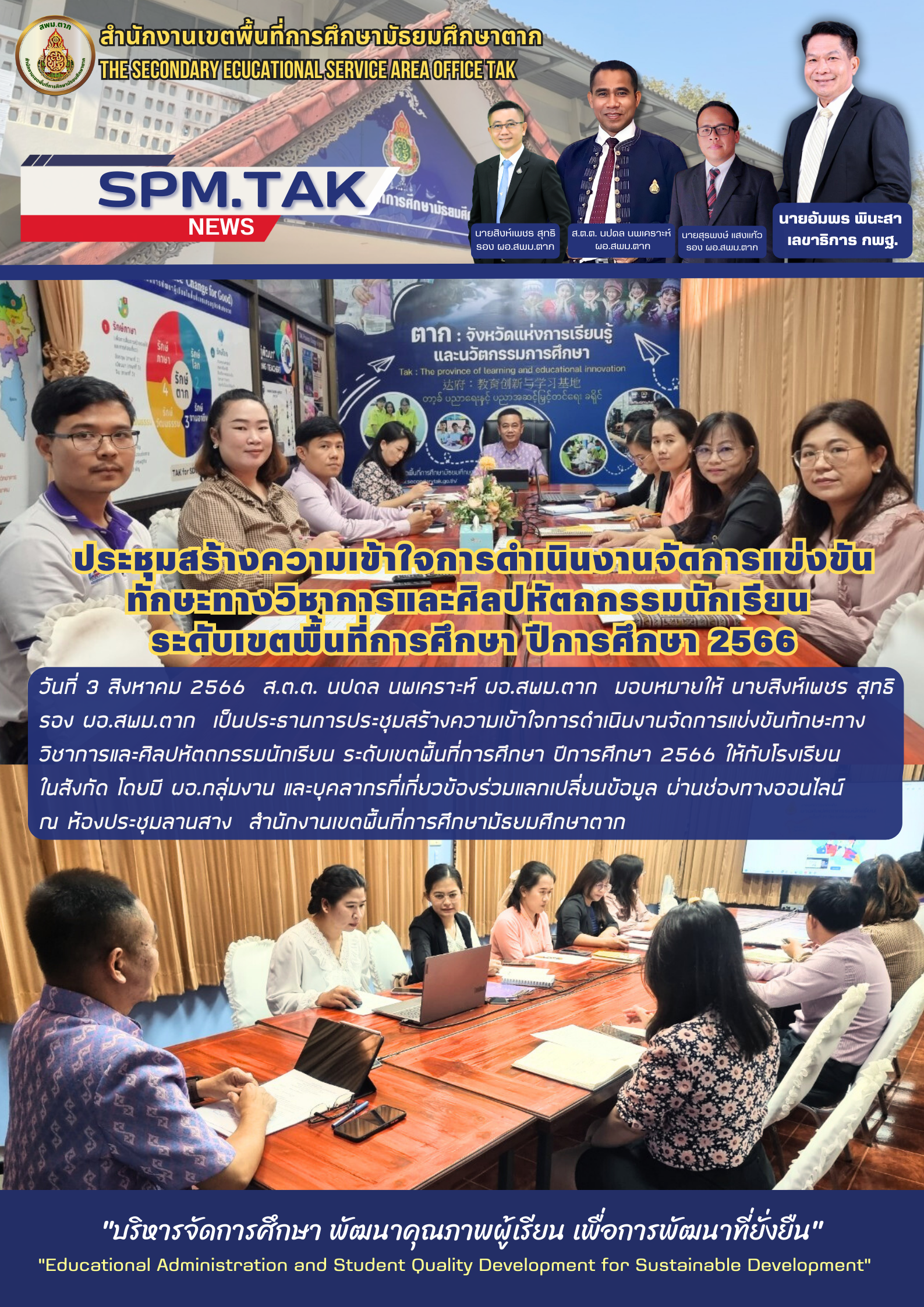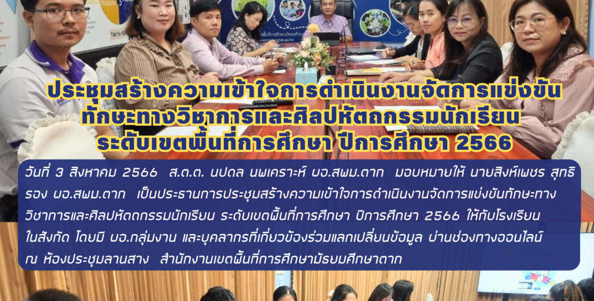 วันที่ 3 สิงหาคม 2566 ส.ต.ต. นปดล นพเคราะห์ ผอ.สพม.ตาก มอบหมายให้ นายสิงห์เพชร สุทธิ รอง ผอ.สพม.ตาก เป็นประธานการประชุมสร้างความเข้าใจการดำเนินงานจัดการแข่งขันทักษะทาง วิชาการและศิลปหัตถกรรมนักเรียน ระดับเขตพื้นที่การศึกษา ปีการศึกษา 2566 ให้กับโรงเรียน ในสังกัด โดยมี ผอ.กลุ่มงาน และบุคลากรที่เกี่ยวข้องร่วมแลกเปลี่ยนข้อมูล ผ่านช่องทางออนไลน์ ณ ห้องประชุมลานสาง สำนักงานเขตพื้นที่การศึกษามัธยมศึกษาตาก