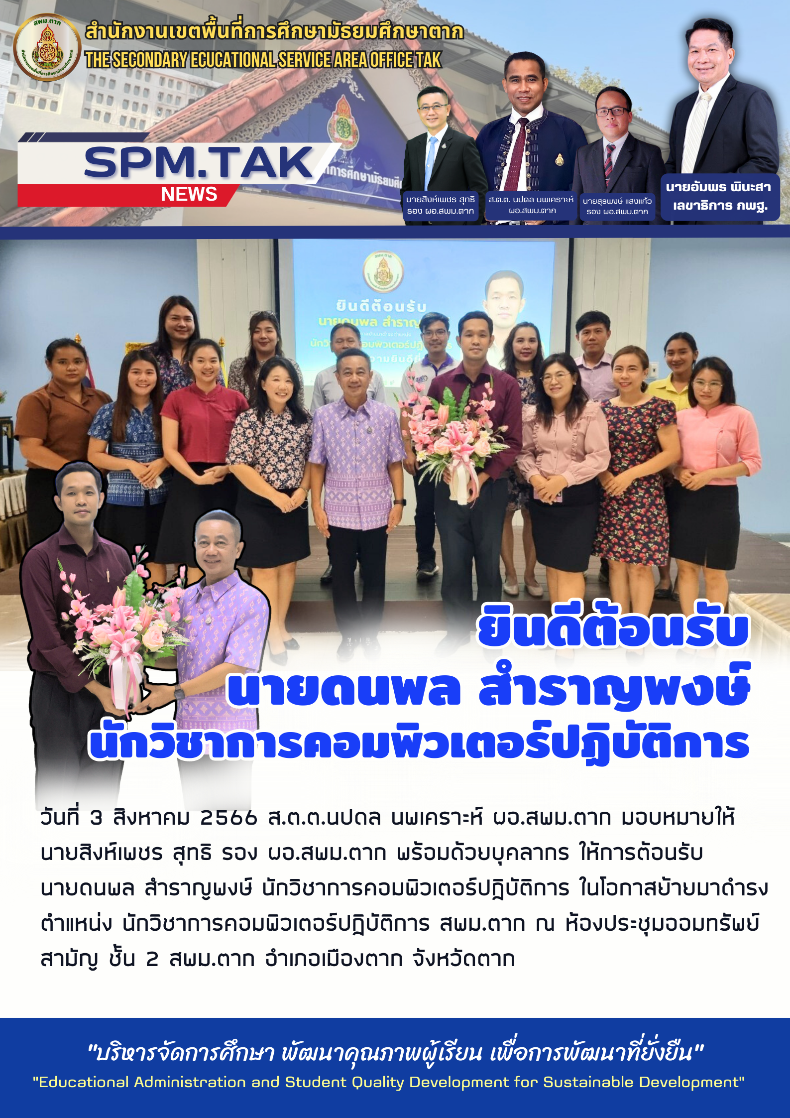 วันที่ 3 สิงหาคม 2566 ส.ต.ต.นปดล นพเคราะห์ ผอ.สพม.ตาก มอบหมายให้ นายสิงห์เพชร สุทธิ พร้อมด้วยบุคลากร ให้การต้อนรับ นายดนพล สำราญพงษ์ นักวิชาการคอมพิวเตอร์ปฏิบัติการ ในโอกาสย้ายมาดำรงตำแหน่ง นักวิชาการคอมพิวเตอร์ปฏิบัติการ สพม.ตาก ณ ห้องประชุมออมทรัพย์สามัญ ชั้น 2 สพม.ตาก อำเภอเมืองตาก จังหวัดตาก