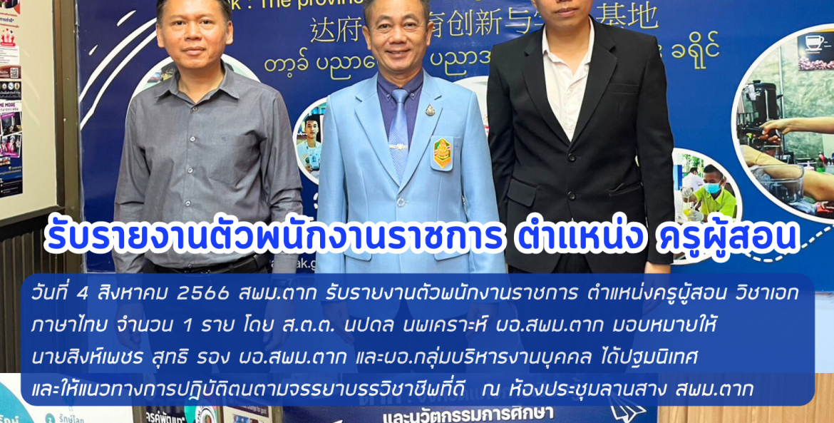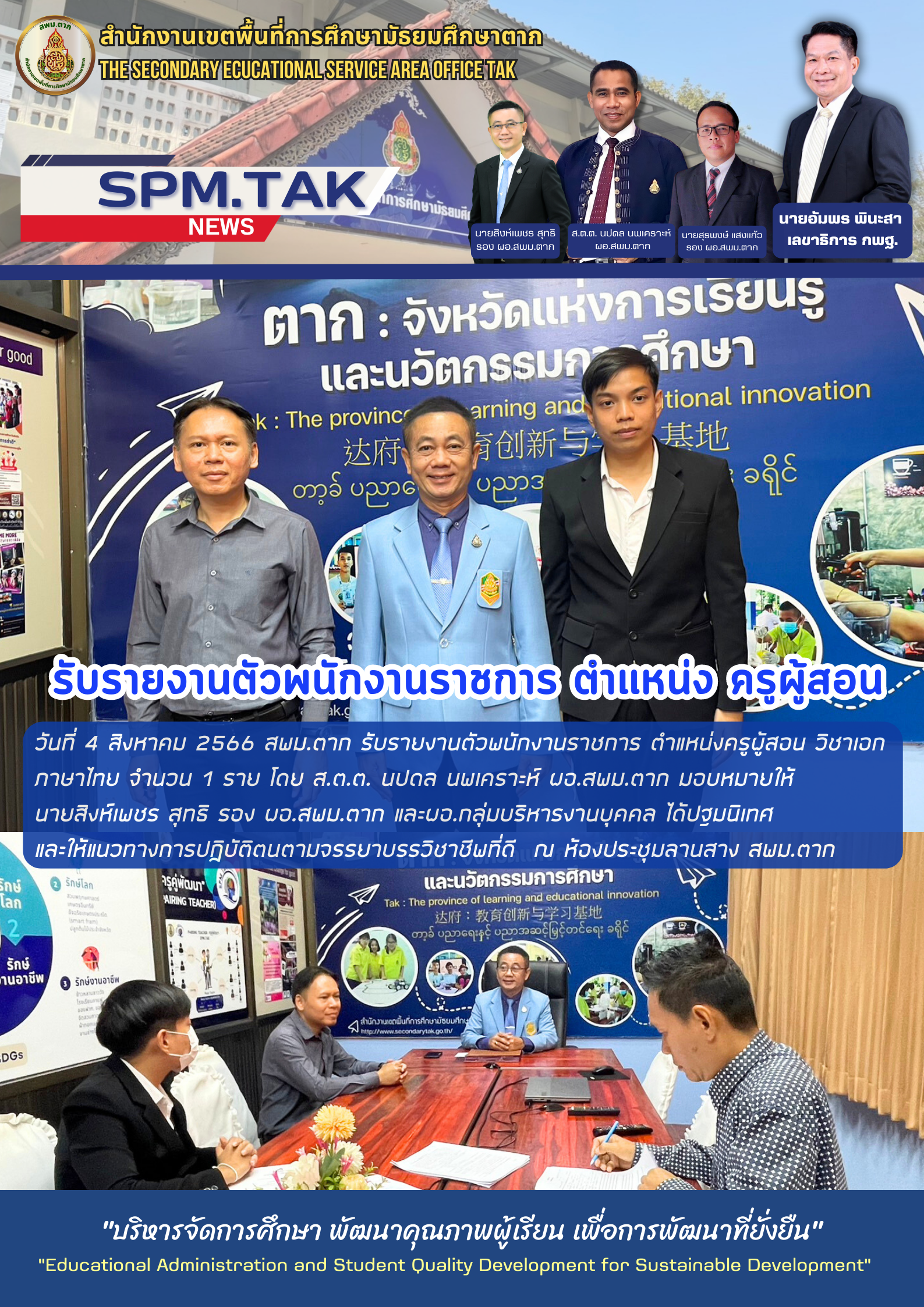 วันที่ 4 สิงหาคม 2566 สพม.ตาก รับรายงานตัวพนักงานราชการ ตำแหน่งครูผู้สอน วิชาเอกภาษาไทย จำนวน 1 ราย โดย ส.ต.ต. นปดล นพเคราะห์ ผอ.สพม.ตาก มอบหมายให้ นายสิงห์เพชร สุทธิ รอง ผอ.สพม.ตาก และผอ.กลุ่มบริหารงานบุคคล ได้ปฐมนิเทศ และให้แนวทางการปฏิบัติตนตามจรรยาบรรวิชาชีพที่ดี ณ ห้องประชุมลานสาง สพม.ตาก