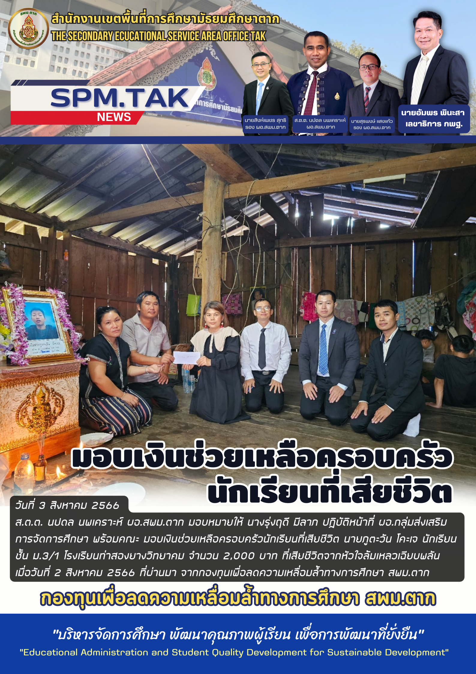 วันที่ 3 สิงหาคม 2566 ส.ต.ต. นปดล นพเคราะห์ ผอ.สพม.ตาก มอบหมายให้ นางรุ่งฤดี มีลาภ ปฏิบัติหน้าที่ ผอ.กลุ่มส่งเสริม การจัดการศึกษา พร้อมคณะ มอบเงินช่วยเหลือครอบครัวนักเรียนที่เสียชีวิต นายภูตะวัน โคะเจ นักเรียน ชั้น ม.3/1 โรงเรียนท่าสองยางวิทยาคม จำนวน 2,000 บาท ที่เสียชีวิตจากหัวใจล้มเหลวเฉียบพลัน เมื่อวันที่ 2 สิงหาคม 2566 ที่ผ่านมา จากกองทุนเพื่อลดความเหลื่อมล้ำทางการศึกษา สพม.ตาก