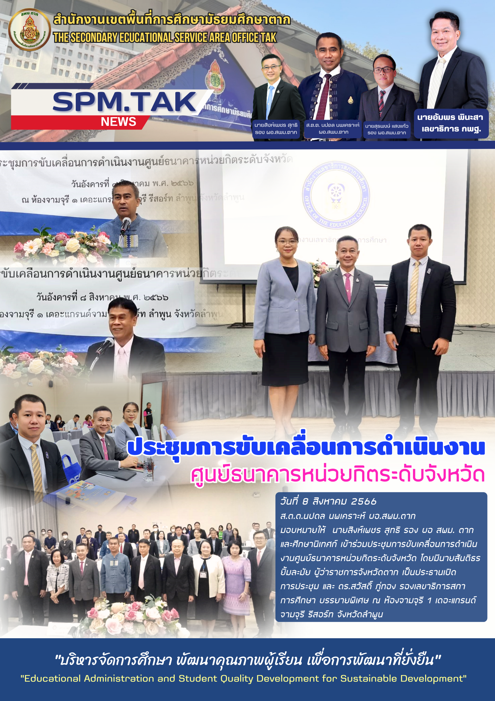 วันที่ 8 สิงหาคม 2566 ส.ต.ต.นปดล นพเคราะห์ ผอ.สพม.ตาก มอบหมายให้ นายสิงห์เพชร สุทธิ รอง ผอ สพม. ตาก และศึกษานิเทศก์ เข้าร่วมประชุมการขับเคลื่อนการดำเนินงานศูนย์ธนาคารหน่วยกิตระดับจังหวัด โดยมีนายสันติธร ยิ้มละมัย ผู้ว่าราชการจังหวัดตาก เป็นประธานเปิด การประชุม และ ดร.สวัสดิ์ ภู่ทอง รองเลขาธิการสภา การศึกษา บรรยายพิเศษ ณ ห้องจามจุรี 1 เดอะแกรนด์ จามจุรี รีสอร์ท จังหวัดลำพูน