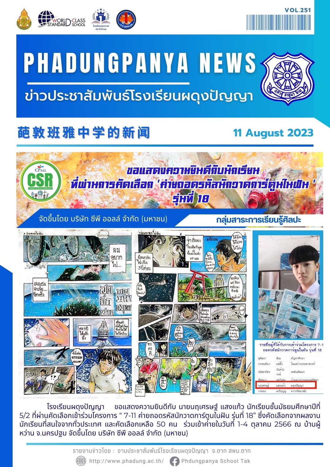 โรงเรียนผดุงปัญญา ขอแสดงความยินดีกับ นายนฤเศรษฐ์ แสงแก้ว นักเรียนชั้นมัธยมศึกษาปีที่ 5/2 ที่ผ่านคัดเลือกเข้าร่วมโครงการ “ 7-11 ค่ายถอดรหัสนักวาดการ์ตูนในฝัน รุ่นที่ 18” ซึ่งคัดเลือกจากผลงานนักเรียนที่สนใจจากทั่วประเทศ และคัดเลือกเหลือ 50 คน ร่วมเข้าค่ายในวันที่ 1-4 ตุลาคม 2566 ณ บ้านผู้หว่าน จ.นครปฐม จัดขึ้นโดย บริษัท ซีพี ออลล์ จำกัด (มหาชน)