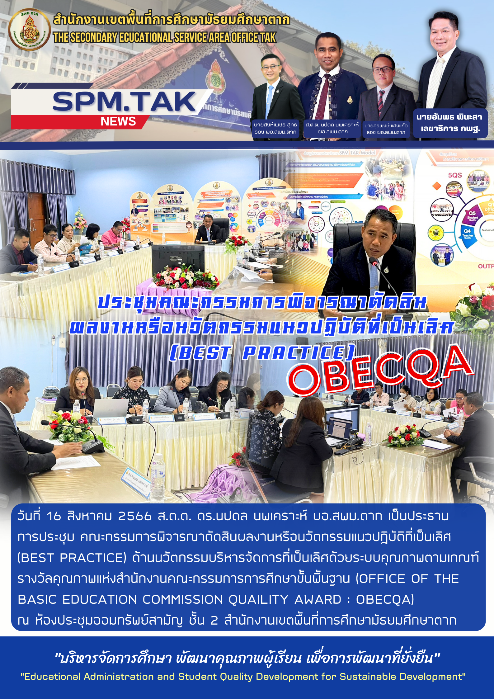 วันที่ 16 สิงหาคม 2566 ส.ต.ต. ดร.นปดล นพเคราะห์ ผอ.สพม.ตาก เป็นประธาน การประชุม คณะกรรมการพิจารณาตัดสินผลงานหรือนวัตกรรมแนวปฏิบัติที่เป็นเลิศ (BEST PRACTICE) ด้านนวัตกรรมบริหารจัดการที่เป็นเลิศด้วยระบบคุณภาพตามเกณฑ์รางวัลคุณภาพแห่งสำนักงานคณะกรรมการการศึกษาขั้นพื้นฐาน (Office of the basic education commission quaility award : OBECQA) ณ ห้องประชุมออมทรัพย์สามัญ ชั้น 2 สำนักงานเขตพื้นที่การศึกษามัธยมศึกษาตาก