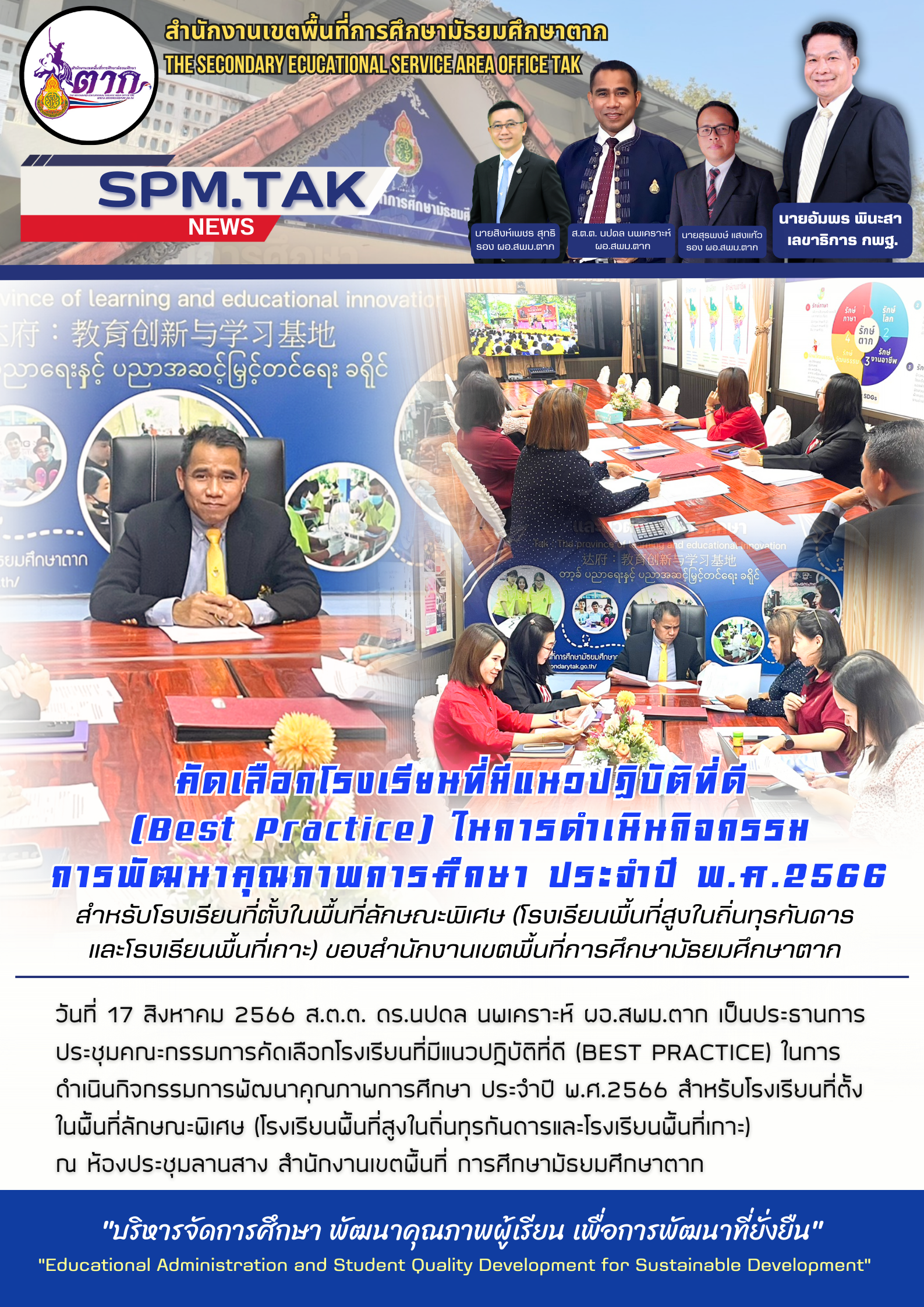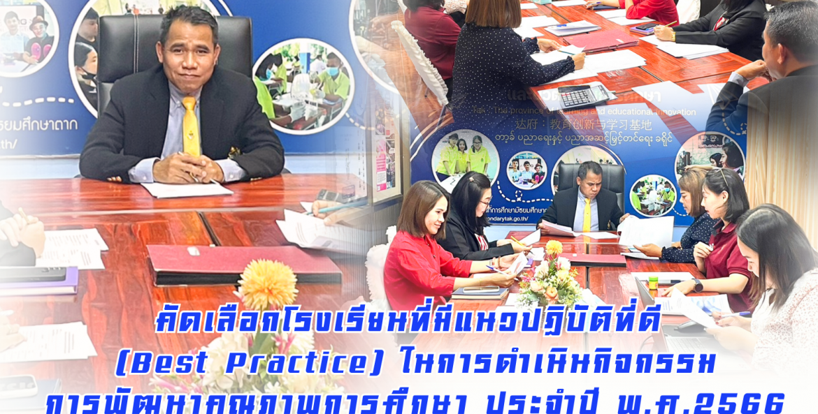 วันที่ 17 สิงหาคม 2566 ส.ต.ต. ดร.นปดล นพเคราะห์ ผอ.สพม.ตาก เป็นประธานการ ประชุมคณะกรรมการคัดเลือกโรงเรียนที่มีแนวปฏิบัติที่ดี (Best Practice) ในการ ดำเนินกิจกรรมการพัฒนาคุณภาพการศึกษา ประจำปี พ.ศ.2566 สำหรับโรงเรียนที่ตั้ง ในพื้นที่ลักษณะพิเศษ (โรงเรียนพื้นที่สูงในถิ่นทุรกันดารและโรงเรียนพื้นที่เกาะ) ณ ห้องประชุมลานสาง สำนักงานเขตพื้นที่ การศึกษามัธยมศึกษาตาก
