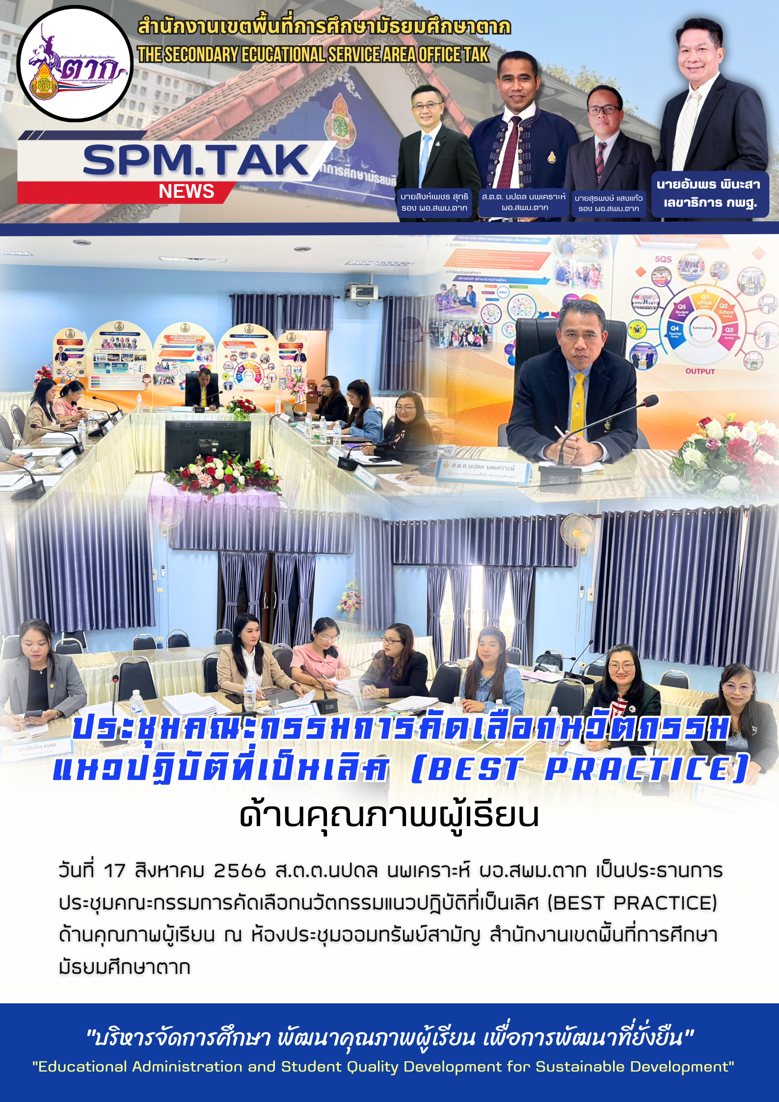 ประชุมคณะกรรมการคัดเลือกนวัตกรรมแนวปฏิบัติที่เป็นเลิศ (BEST PRACTICE) ด้านคุณภาพผู้เรียน วรวุฒิ เนื้อนิ่ม 18 สิงหาคม 2566 วันที่ 17 สิงหาคม 2566 ส.ต.ต.นปดล นพเคราะห์ ผอ.สพม.ตาก เป็นประธานการ ประชุมคณะกรรมการคัดเลือกนวัตกรรมแนวปฏิบัติที่เป็นเลิศ (BEST PRACTICE) ด้านคุณภาพผู้เรียน ณ ห้องประชุมออมทรัพย์สามัญ สำนักงานเขตพื้นที่การศึกษา มัธยมศึกษาตาก จำนวนคนดู 13
