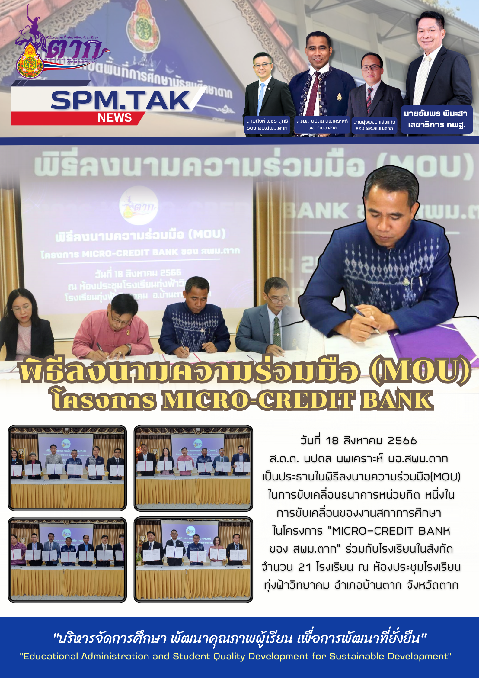 วันที่ 18 สิงหาคม 2566 ส.ต.ต. นปดล นพเคราะห์ ผอ.สพม.ตาก เป็นประธานในพิธีลงนามความร่วมมือ(MOU) ในการขับเคลื่อนธนาคารหน่วยกิต หนึ่งในการขับเคลื่อนของงานสภาการศึกษา ในโครงการ “Micro-Credit Bank ของ สพม.ตาก” ร่วมกับโรงเรียนในสังกัด จำนวน 21 โรงเรียน ณ ห้องประชุมโรงเรียนทุ่งฟ้าวิทยาคม อำเภอบ้านตาก จังหวัดตาก