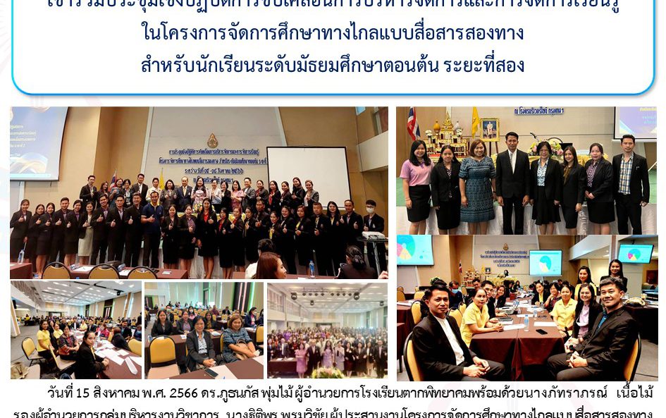 วันที่ 15 สิงหาคม พ.ศ. 2566 ดร.ภูธนภัส พุ่มไม้ ผู้อำนวยการโรงเรียนตากพิทยาคมพร้อมด้วยนางภัทราภรณ์ เนื้อไม้ รองผู้อำนวยการกลุ่มบริหารงานวิชาการ นางฐิติพร พรมวิชัย ผู้ประสานงานโครงการจัดการศึกษาทางไกลแบบสื่อสารสองทาง สำหรับระดับมัธยมศึกษาตอนต้น (Interactive Distance Learning: IDL) และครูผู้สอนใน 5 กลุ่มสาระฯ ได้แก่ ภาษาไทย คณิตศาสตร์ วิทยาศาสตร์ สังคมศึกษาศาสนาและวัฒนธรรม และภาษาอังกฤษ เข้าร่วมประชุมเชิงปฏิบัติการการขับเคลื่อนการบริหารจัดการและการจัดการเรียนรู้ โครงการจัดการศึกษาทางไกลแบบสื่อสารสองทาง สำหรับระดับมัธยมศึกษาตอนต้น ระยะที่ 2 โดยมีวัตถุประสงค์เพื่อยกระดับผลสัมฤทธิ์ทางการเรียนของนักเรียนโรงเรียนปลายทางในโครงการ พัฒนาศักยภาพการจัดการเรียนการสอนของครูในโครงการ และพัฒนารูปแบบการจัดการศึกษาทางไกลแบบสื่อสารสองทางสำหรับระดับมัธยมศึกษาตอนต้นให้มีประสิทธิผลดียิ่งขึ้น ระหว่างวันที่ 15 – 18 สิงหาคม พ.ศ. 2566 ณ โรงแรมริเวอร์ไซด์ กรุงเทพมหานคร