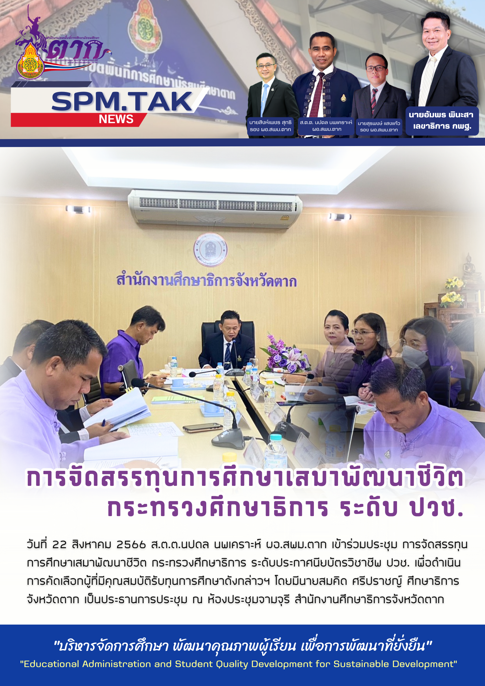 วันที่ 22 สิงหาคม 2566 ส.ต.ต.นปดล นพเคราะห์ ผอ.สพม.ตาก เข้าร่วมประชุม การจัดสรรทุนการศึกษาเสมาพัฒนาชีวิต กระทรวงศึกษาธิการ ระดับประกาศนียบัตรวิชาชีพ ปวช. เพื่อดำเนินการคัดเลือกผู้ที่มีคุณสมบัติรับทุนการศึกษาดังกล่าวฯ โดยมีนายสมคิด ศรีปราชญ์ ศึกษาธิการ จังหวัดตาก เป็นประธานการประชุม ณ ห้องประชุมจามจุรี สำนักงานศึกษาธิการจังหวัดตาก